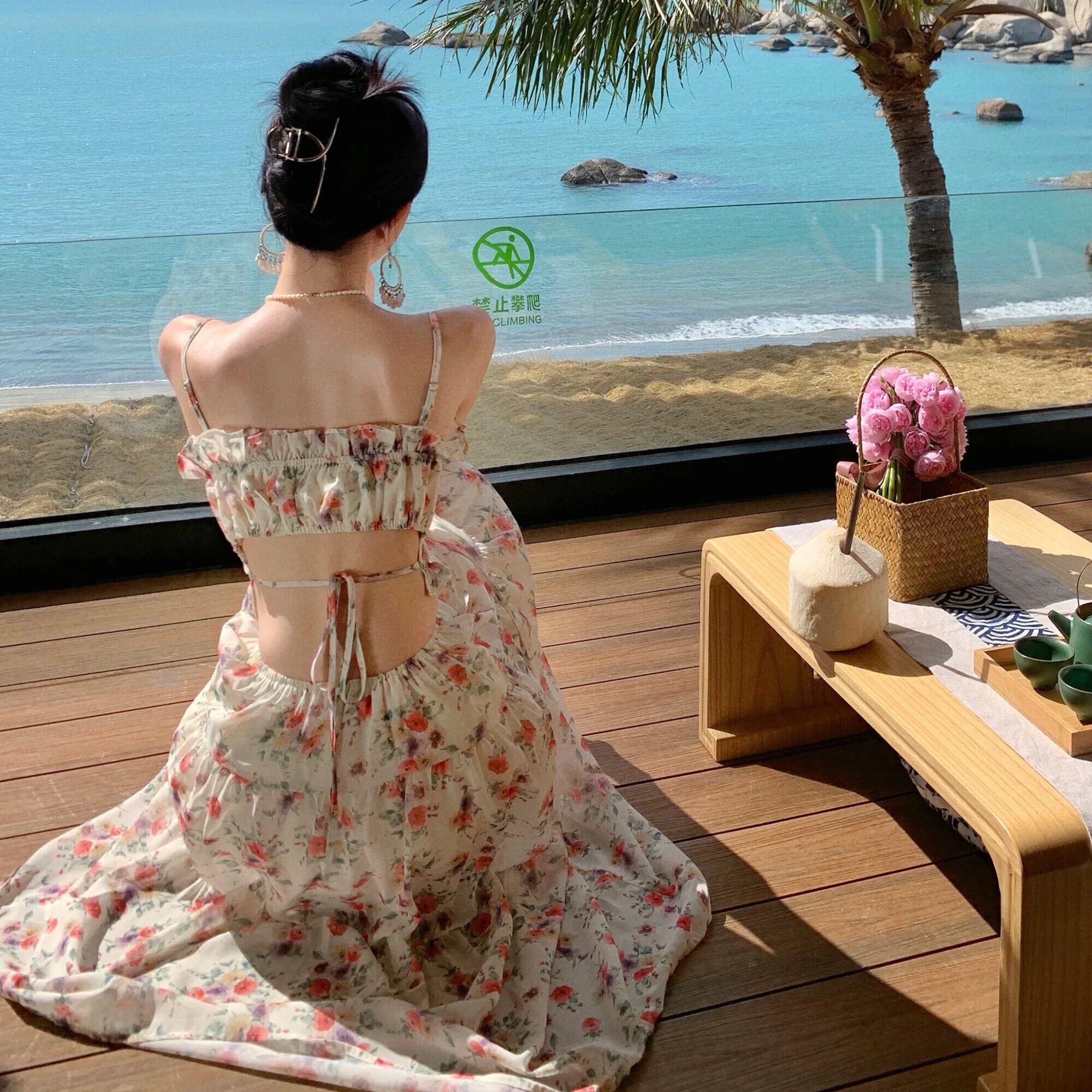 Pinkoz 滑走路デザイナースパゲッティストラップ花柄プリントミディドレス背中開いたセクシーホリデーシックローブデムジェ Vestidos ピンク
