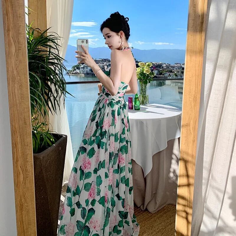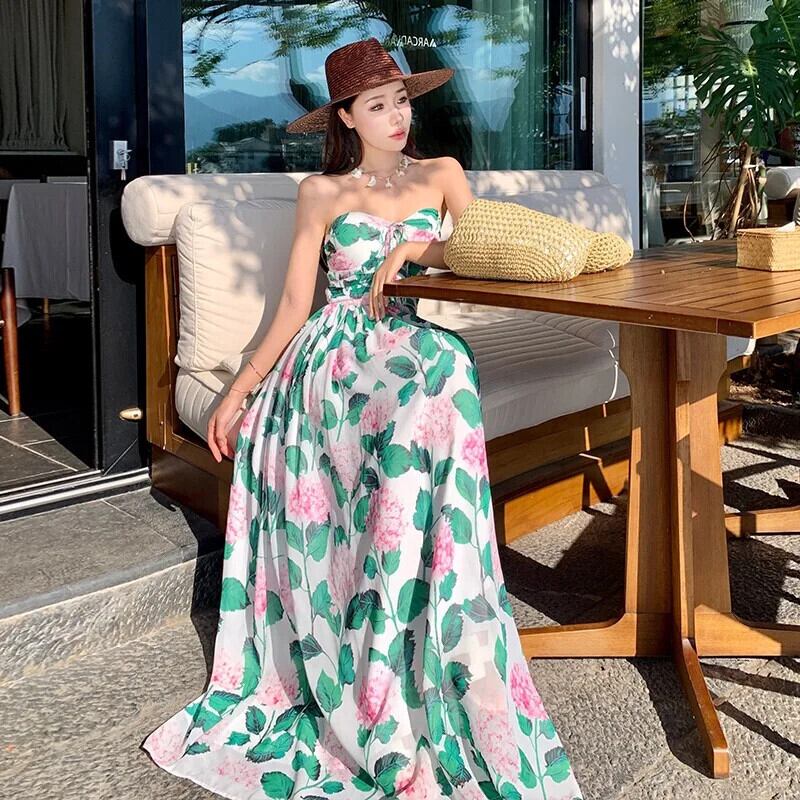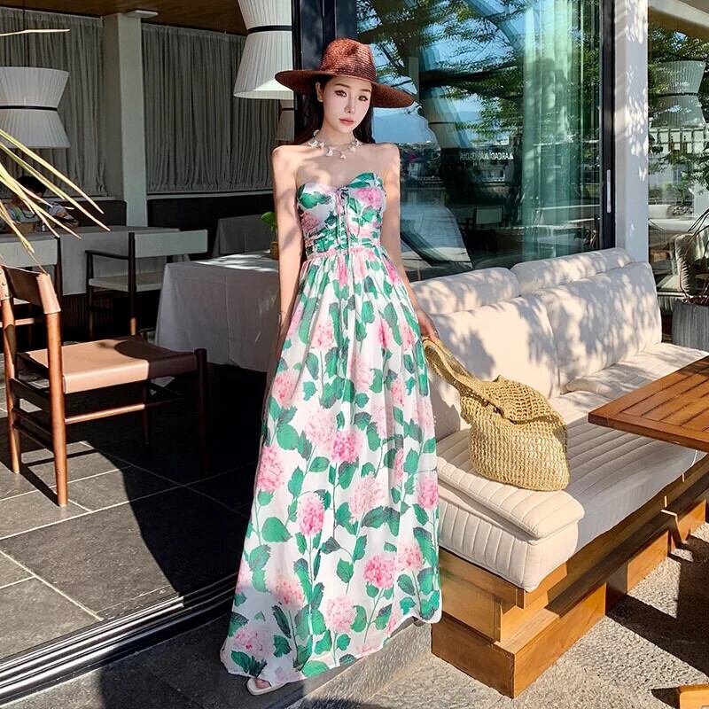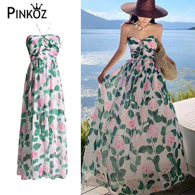 Pinkoz ホリデーシック新花柄プリントストラップレスマキシドレスぬるぬる A ラインスパゲッティストラップキャミソール Vestido ピンク Aライン