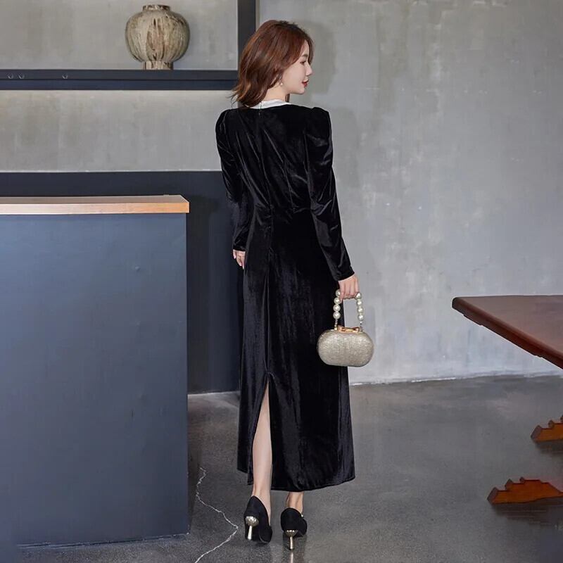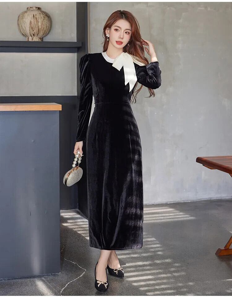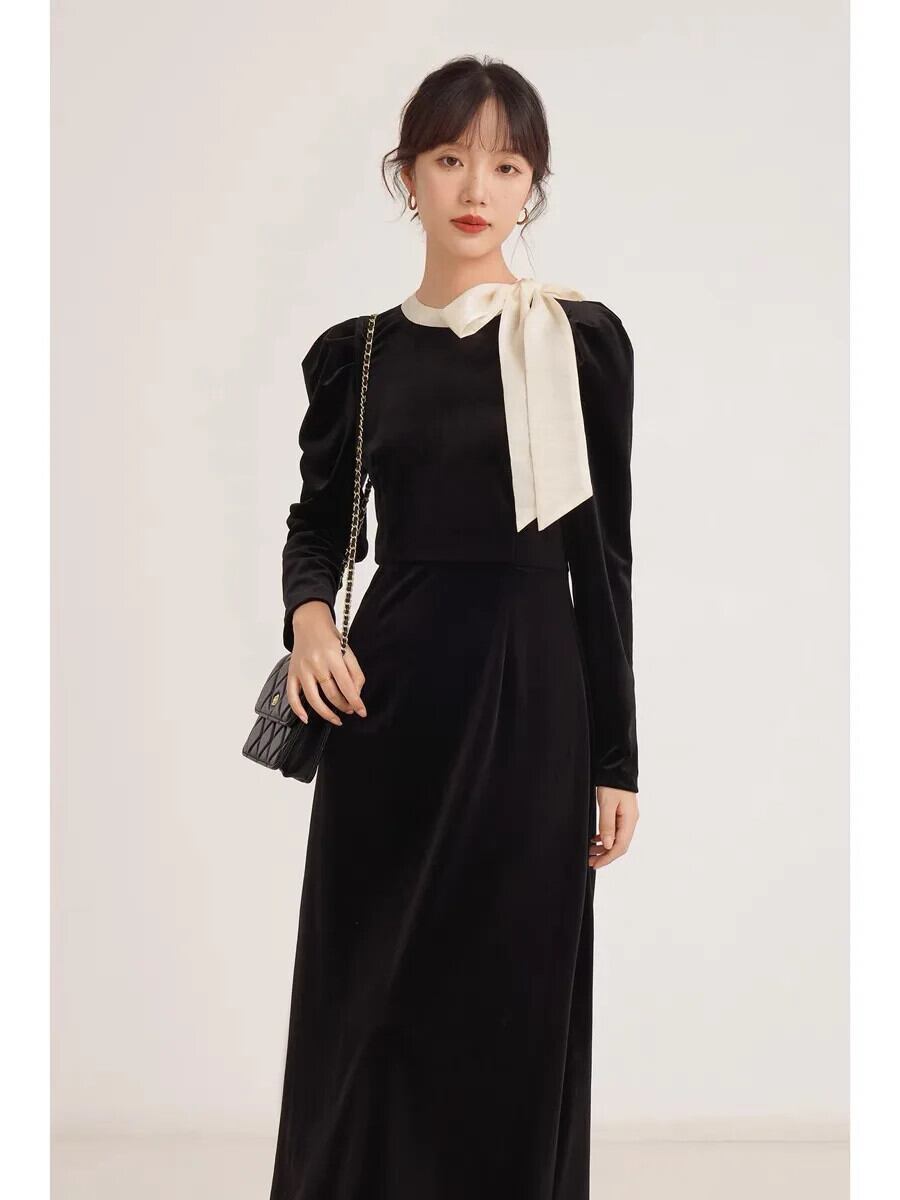Pinkoz 秋冬黒ベルベットミディロングドレス弓襟ヴィンテージフレンチシック A ラインゴシックパリドレスvestidos ピンク ブラック リボン オータム 秋物 ウィンター 冬物 Aライン ビンテージ