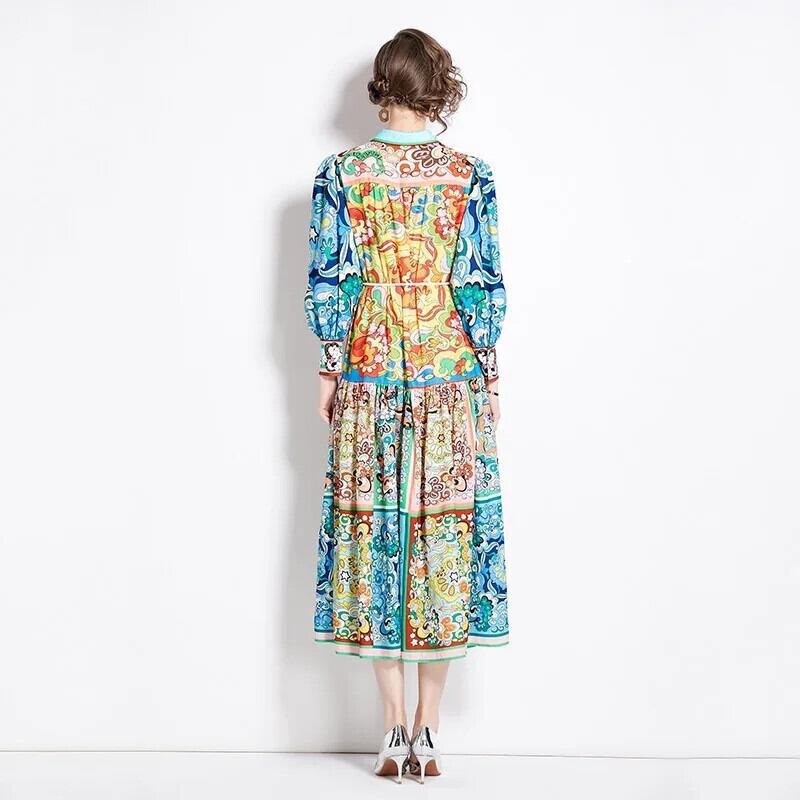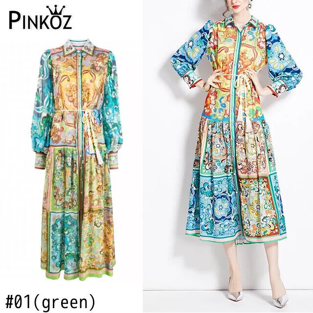 Pinkoz ターンダウン襟ファッションマキシドレスシングルブレスト花柄プリントレースアップドレスvestidos休日 ピンク