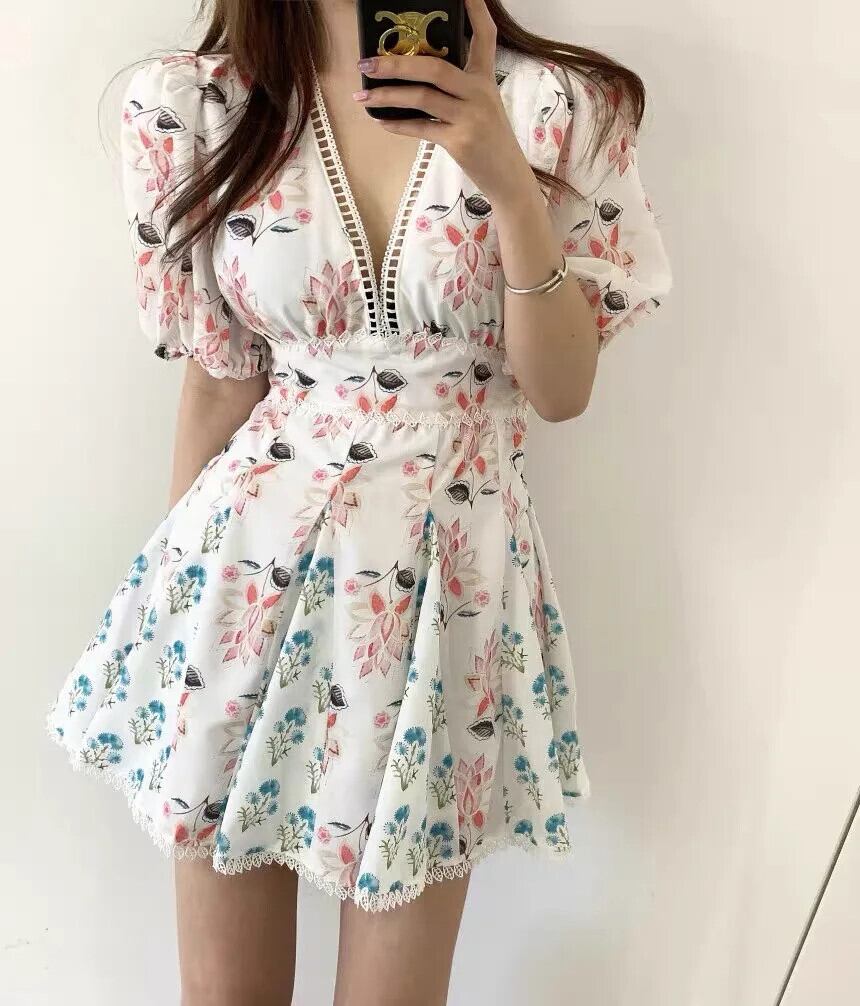 Pinkoz 新人ファッションデザイナースタイリッシュ花柄 A ラインミニドレスパッチワークレース V ネックパフスリーブサマーパーティードレスローブ ピンク 夏物 Vネック Aライン