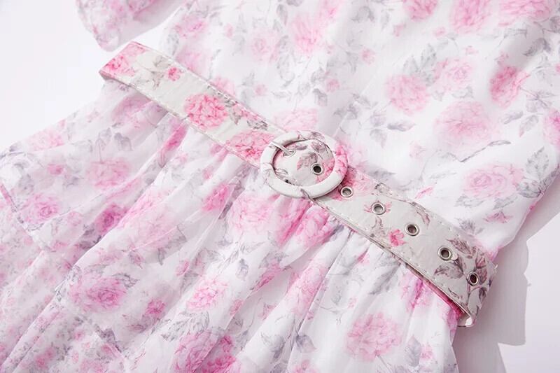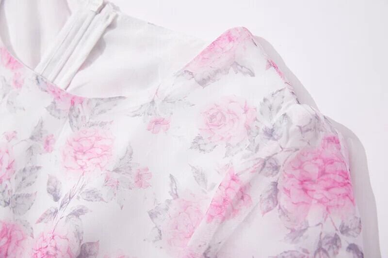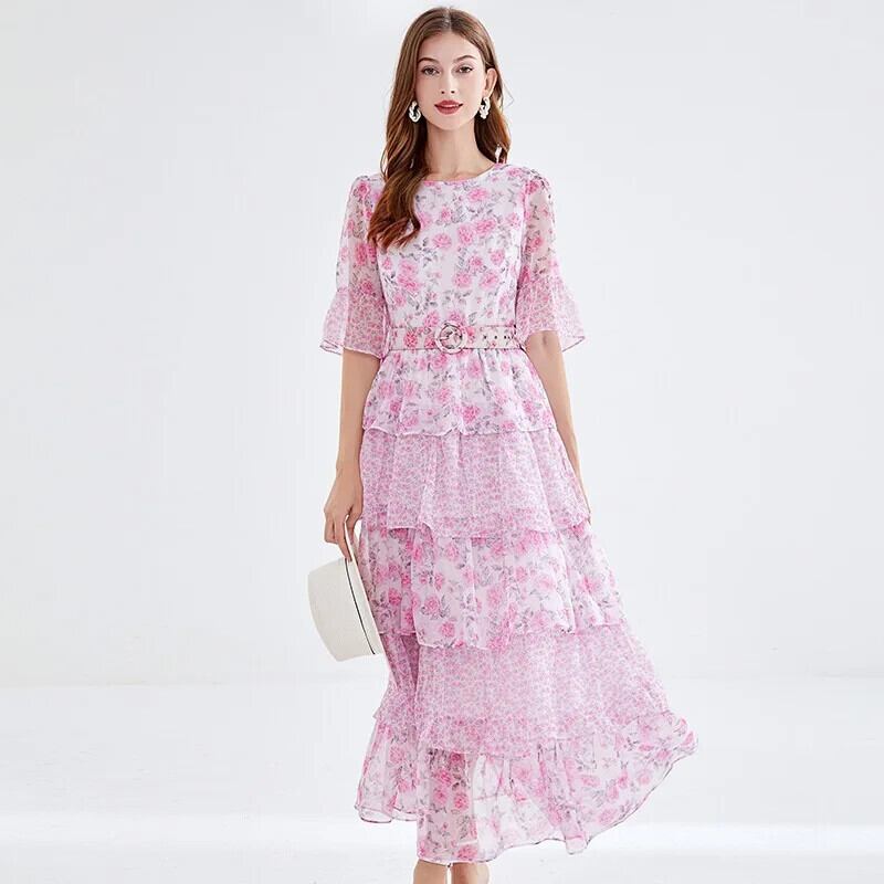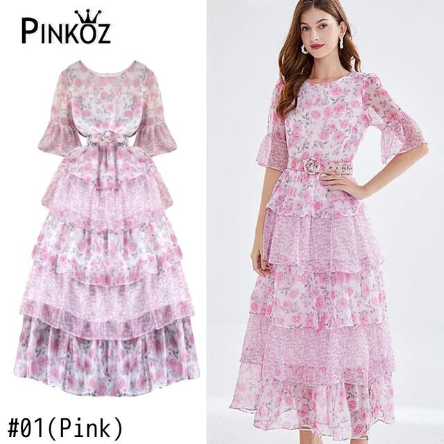 Pinkoz 滑走路デザイナーファッション衣類 o ネックピンク花柄プリントフレアスリーブマキシカスケードレイヤードロングドレスローブ レッド Oネック