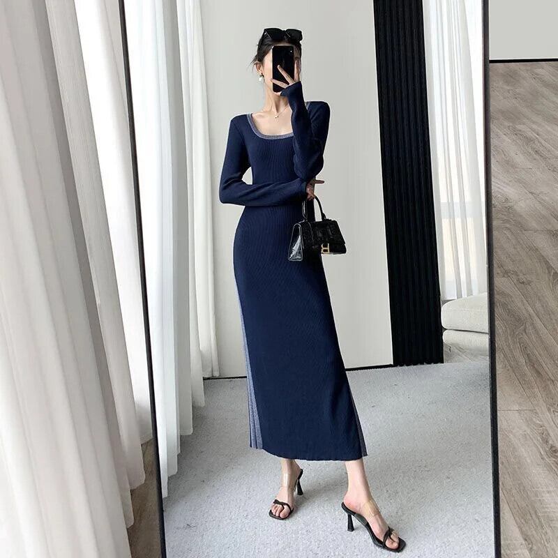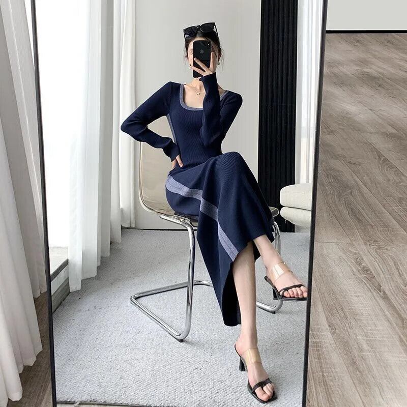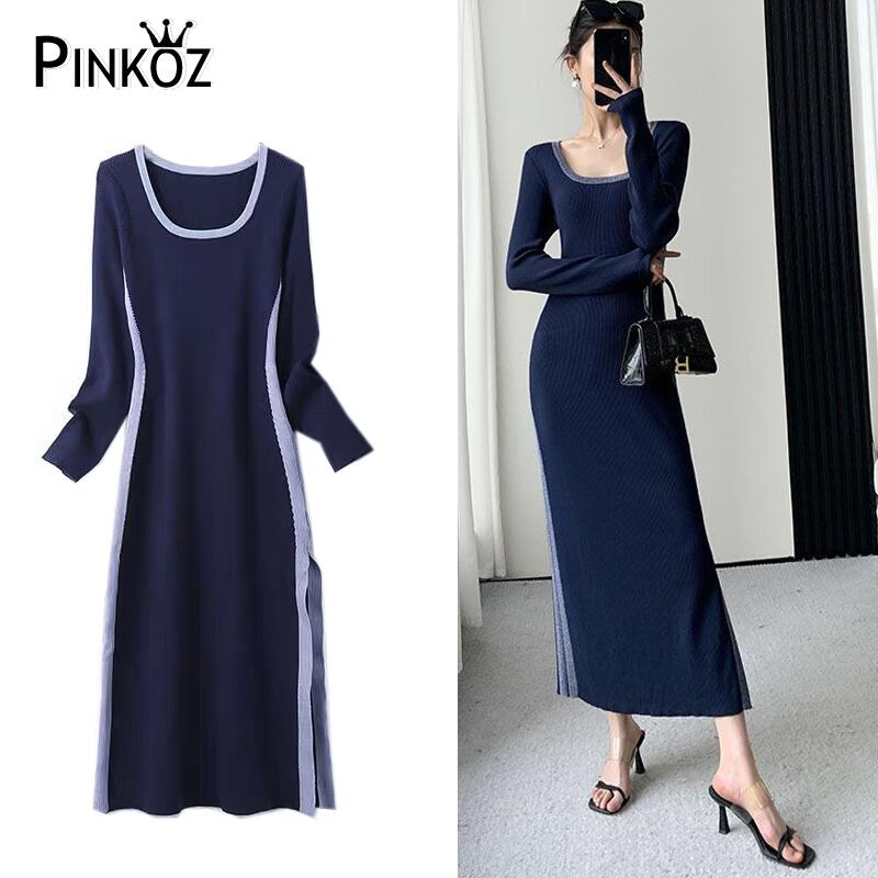 Pinkoz ネイビーブルー O ネック長袖ドレスミディ分割ニットファッションエレガント作業秋冬 Vestidos ロング ピンク オータム 秋物 ウィンター 冬物 Oネック