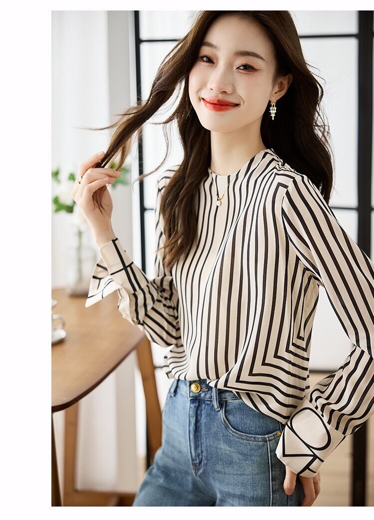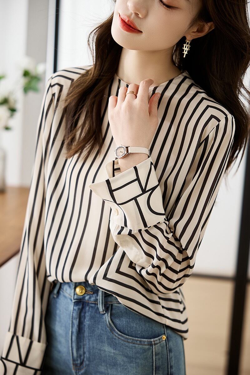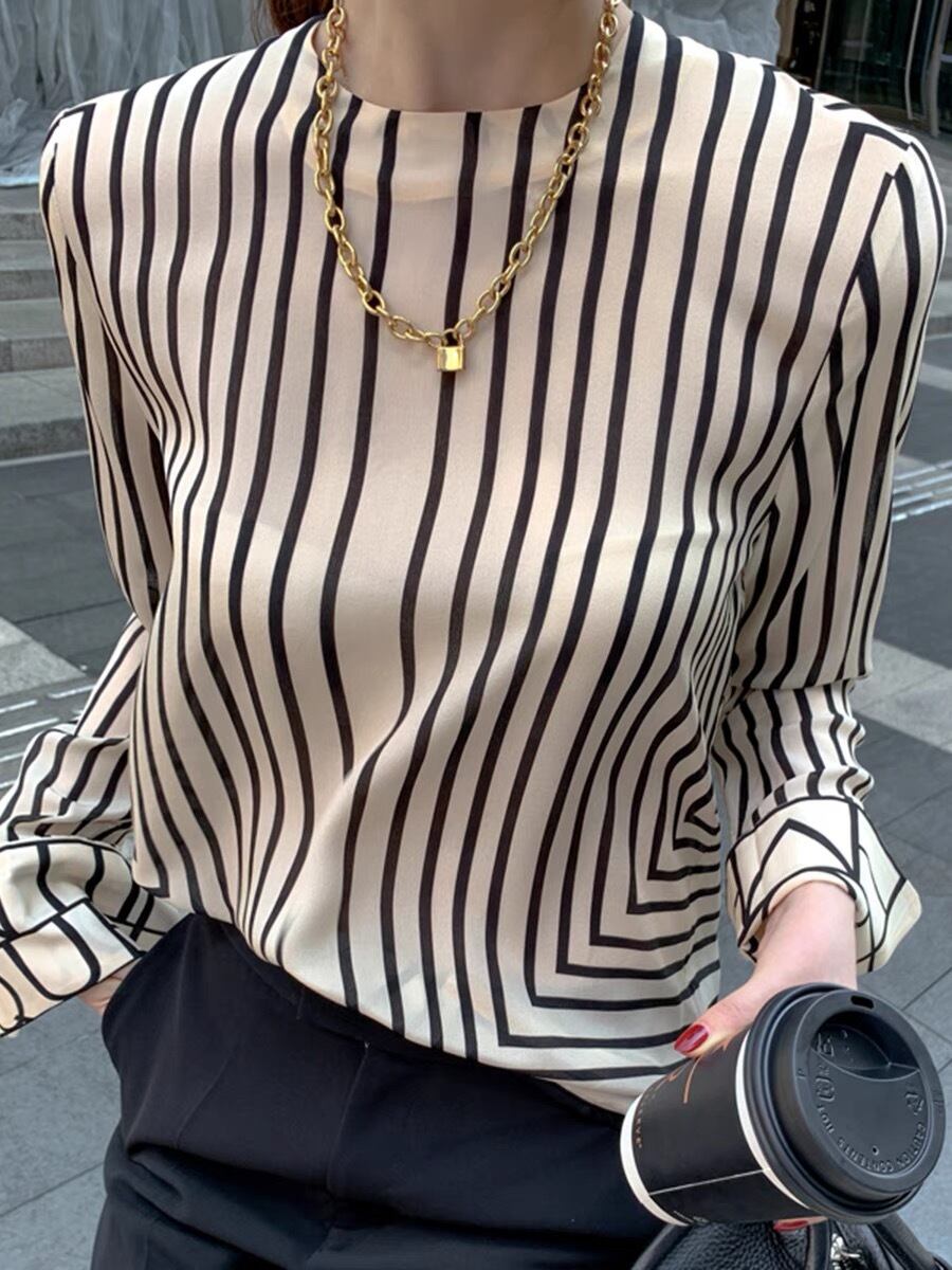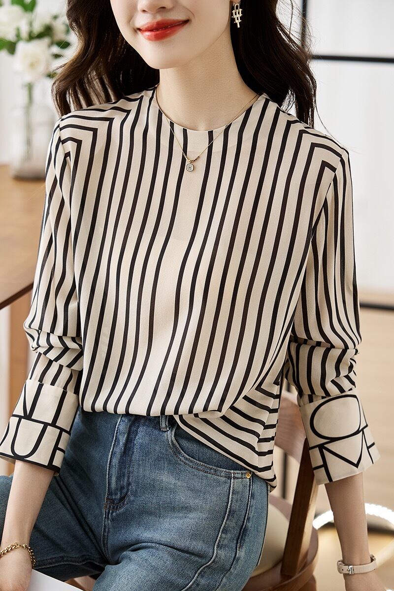 Pinkoz デザイナーベージュストライプ o ネックシフォンルーズオフィスレディビッグサイズ 2xl ブラウスシャツカジュアルプルオーバートップスヴィンテージ ピンク Oネック ビンテージ 会社 学校 通勤や通学にも