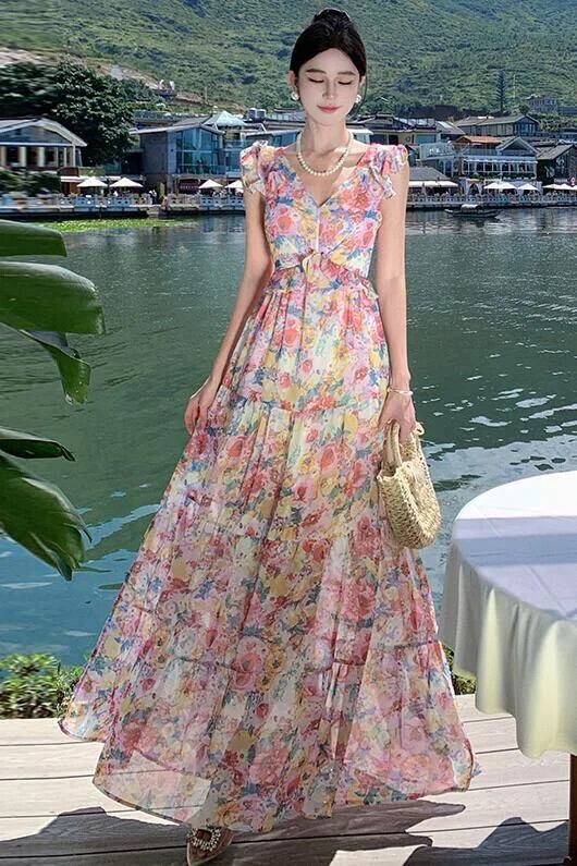 Pinkoz 春夏花柄フリルシフォン v ネックマキシドレスパーティーナイトロングシックファッションvestidos ピンク ラッフル スプリング 春物 サマー 夏物 Vネック