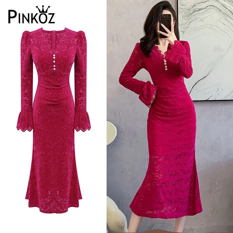 Pinkoz 滑走路デザイナーフクシア v ネックレースぬるぬるマーメイドドレスボディコンペンシルエレガントパーティーオフィスレディ Vestidos ヴィンテージローブ ピンク Vネック ビンテージ 会社 学校 通勤や通学にも