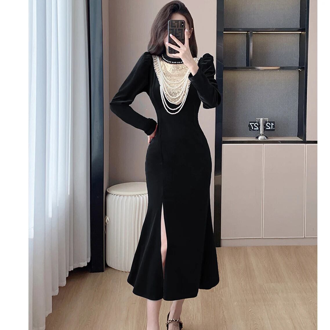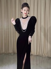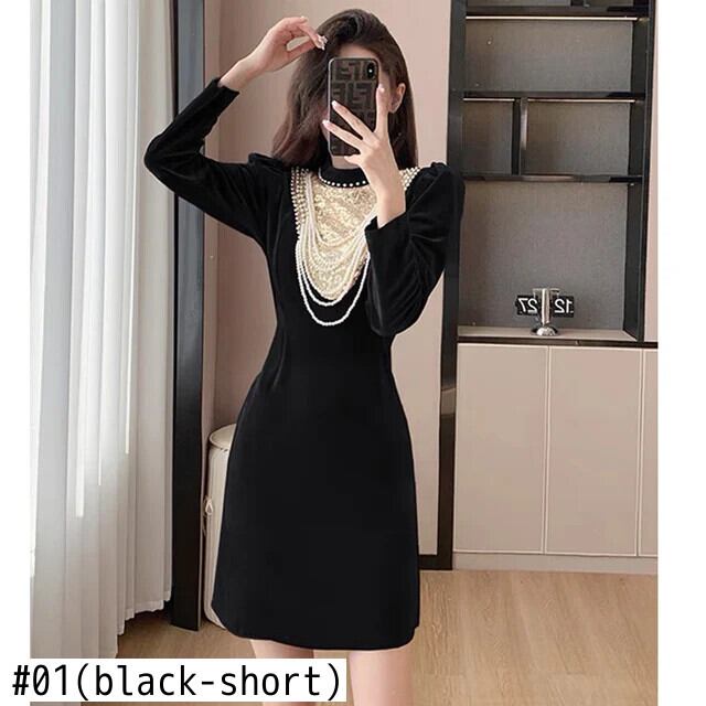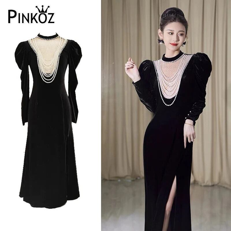 Pinkoz 滑走路デザイナーエレガントスタンドカラーパフスリーブスプリットベルベットミディドレスビーズスパンコール高級パーティードレスvestidos ピンク