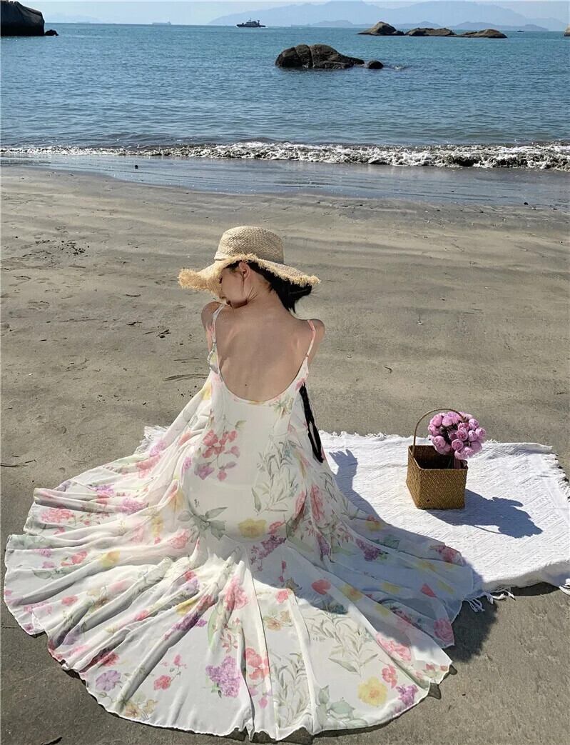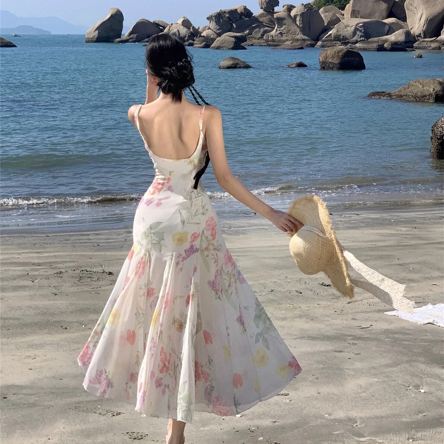 Pinkoz 夏休みファッション花柄スパゲッティストラップミディドレスシフォンキャミソールローブデムジェ Vestidos ヴィンテージ ピンク サマー 夏物 ビンテージ