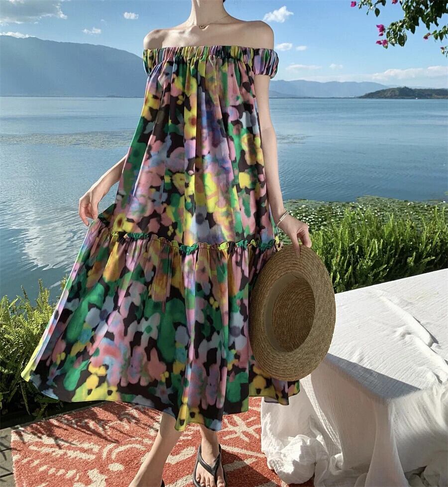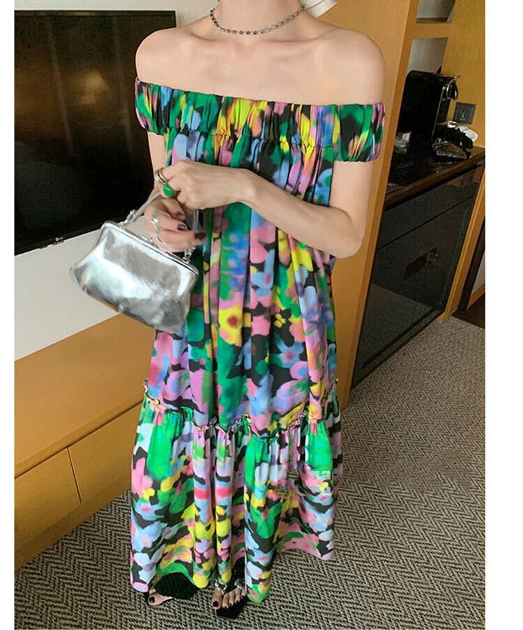 Pinkoz 春夏スラッシュネック花柄ホリデールーズノースリーブミディドレスファッション衣類カジュアルビーチ ピンク スプリング 春物 サマー 夏物