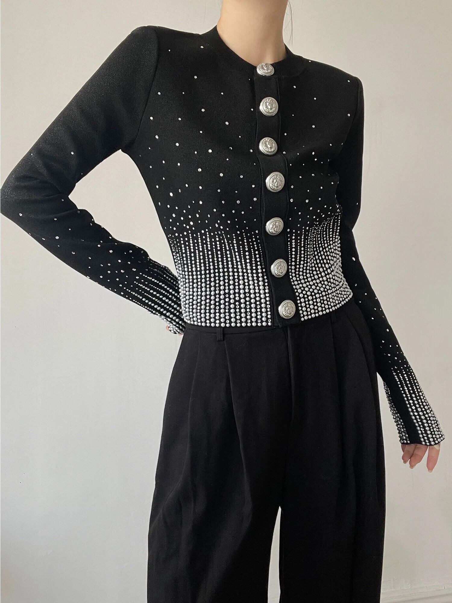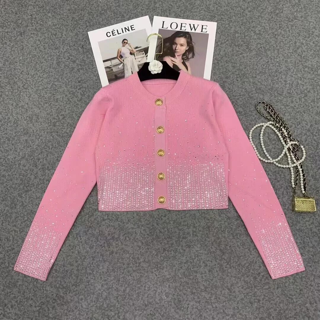 Pinkoz 滑走路デザイナークリスタルダイヤモンド o ネックフルスリーブボタンシングルぬるぬるニットカーディガンセータートップスぬるぬるヴィンテージ ピンク Oネック ビンテージ