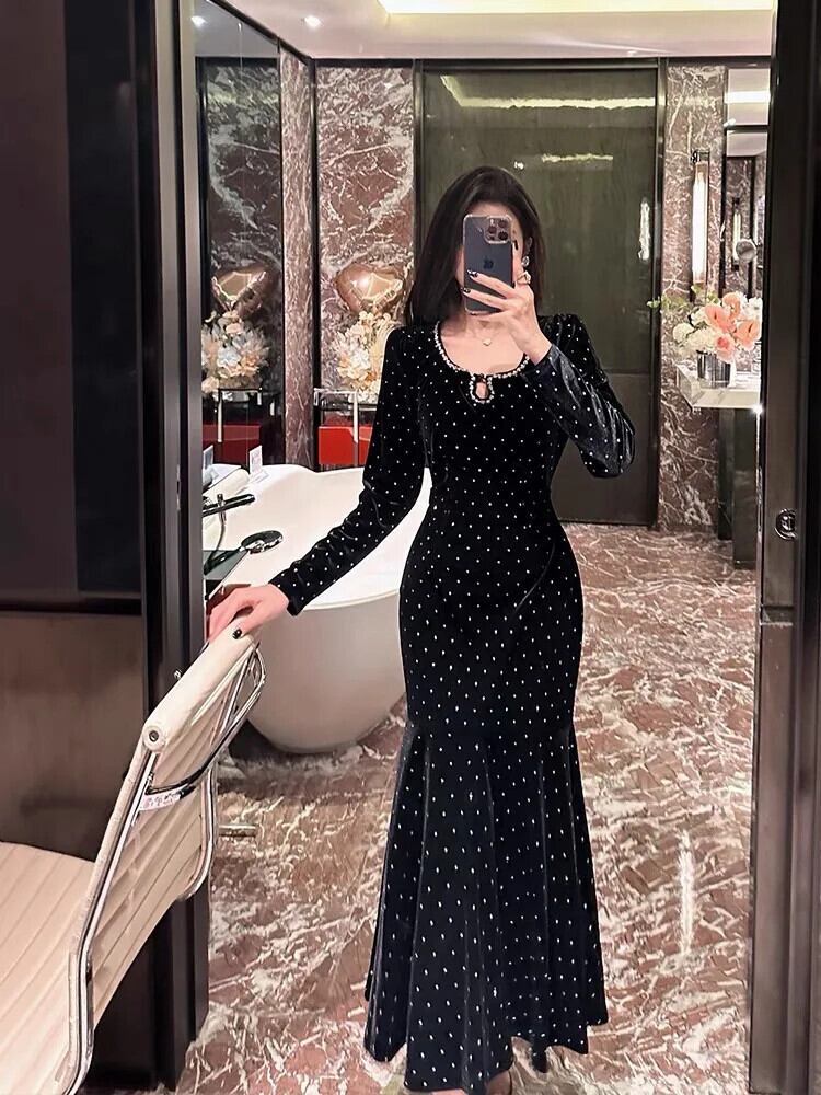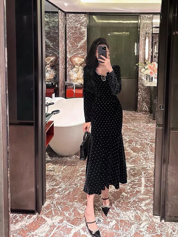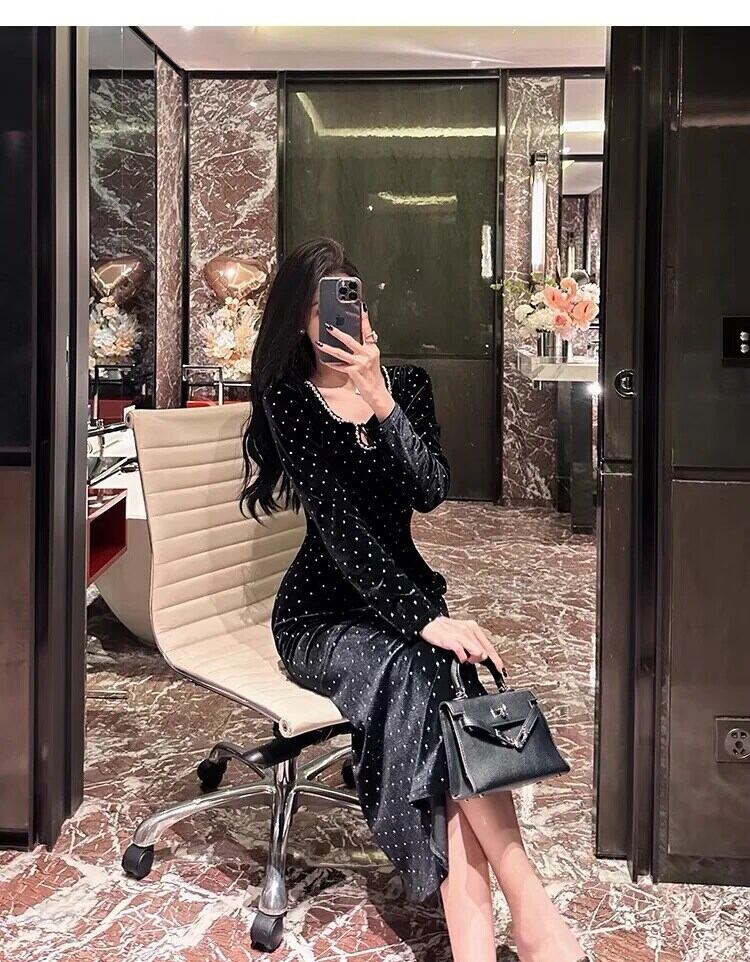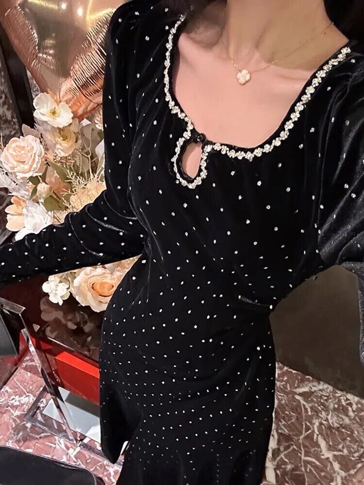 Pinkoz スクエアカラークリスタルブラック水玉ベルベットミニドレスエレガントナイトパーティー作業マーメイド Vestidos ヴィンテージローブ ピンク スクウェア ビンテージ