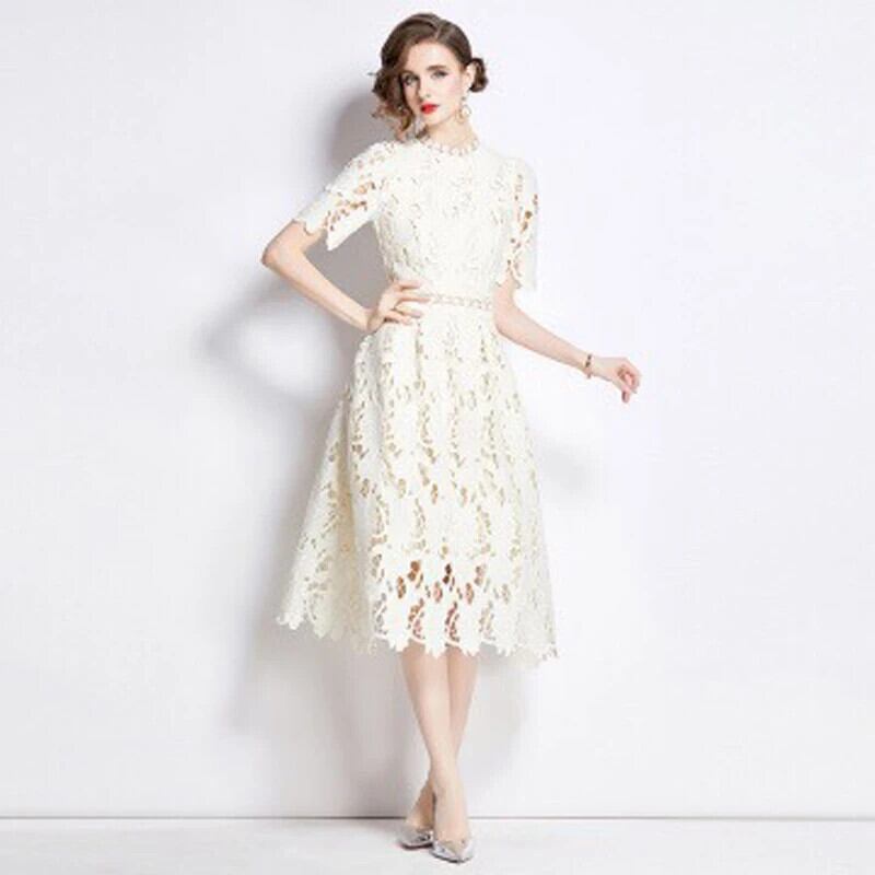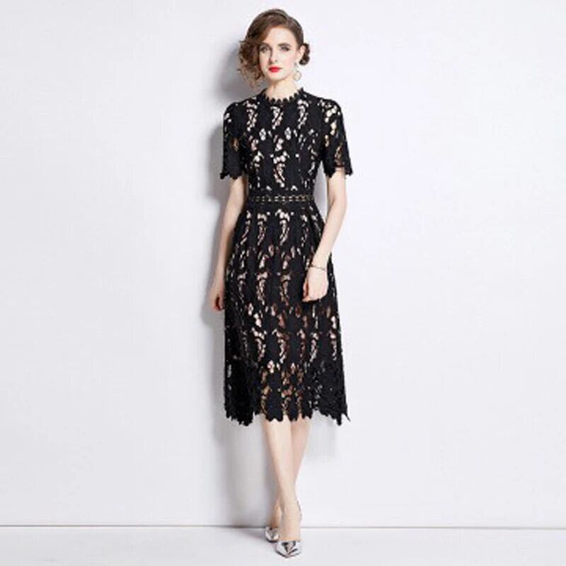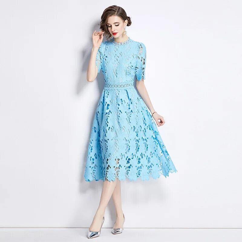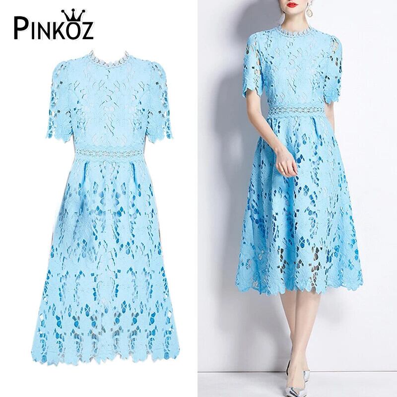 Pinkoz デザイナーブルーレース刺繍アウト O ネック半袖ミディドレスパーティーファム Vestidos ローブシック ショート ピンク ハーフスリーブ Oネック フェミニン
