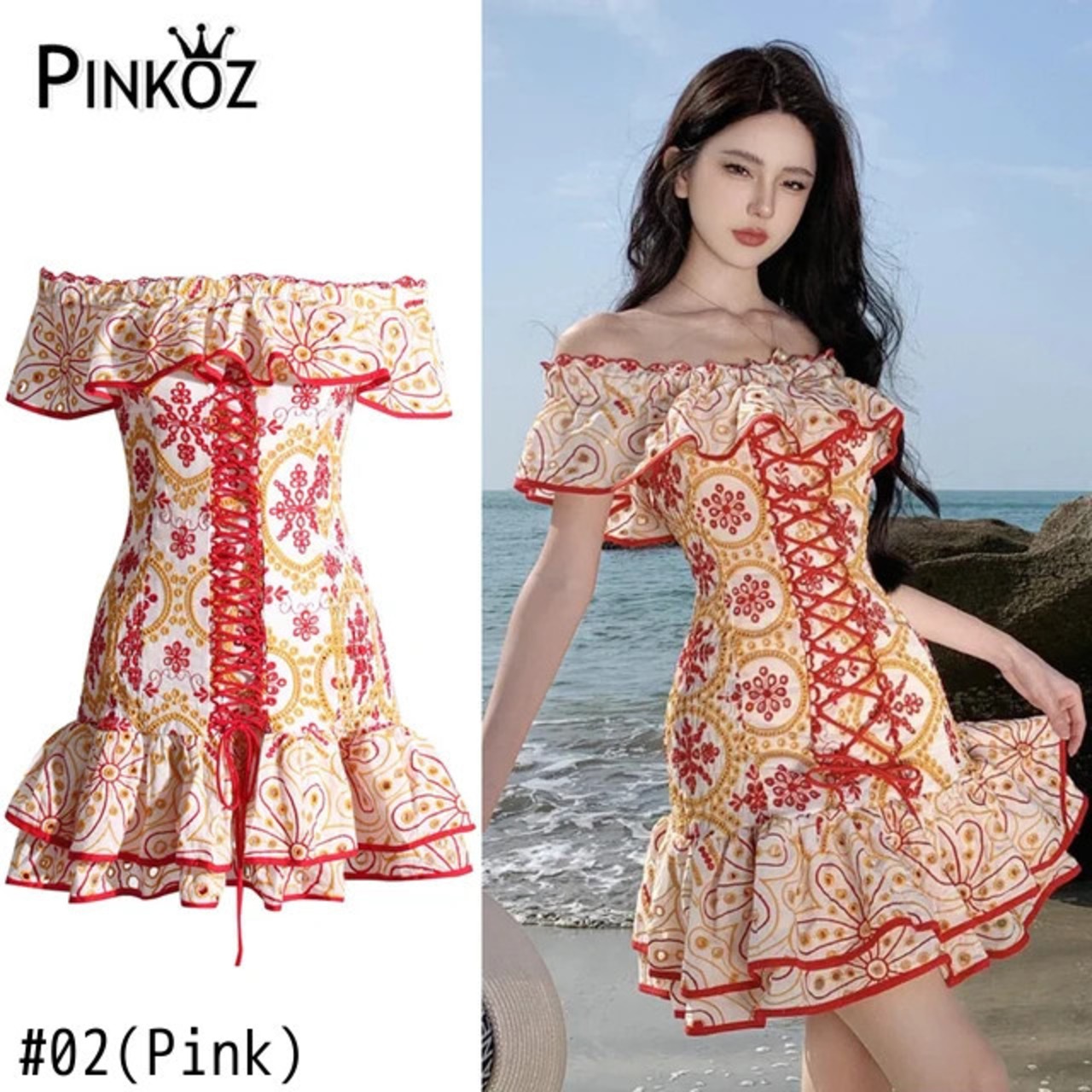 Pinkoz 滑走路デザイナー高級ストローストリンググリーンフラワー刺繍スラッシュネックフリルミニドレスぬるぬるパーティー高級vestidos y2k ピンク ラッフル フラワーデザイン