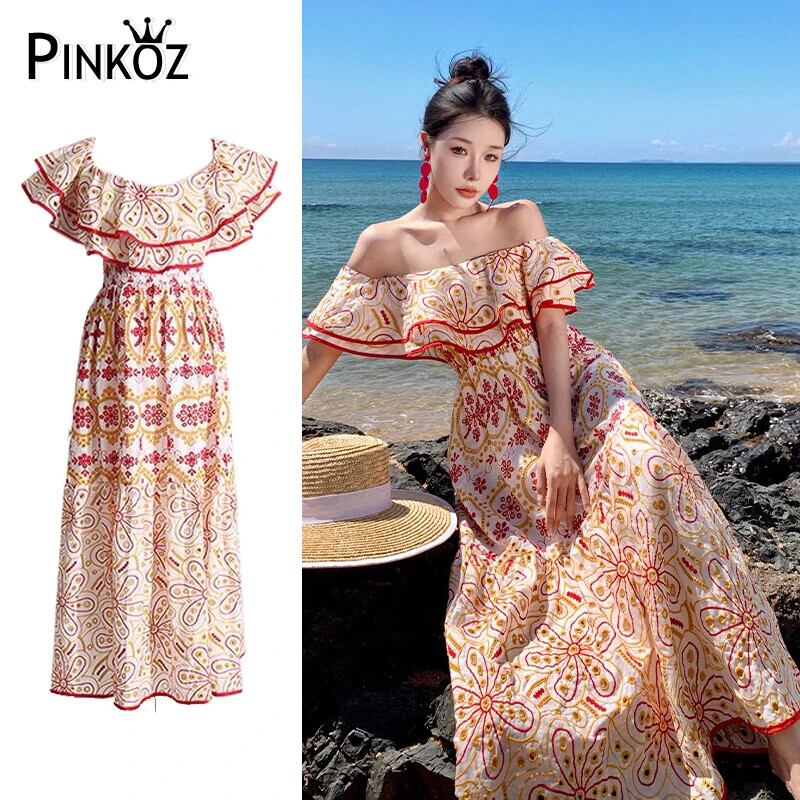 Pinkoz スタイリッシュドレスピンク刺繍レースアウトスラッシュネックフリルロングドレス A ライン Vestidos femenino ヴィンテージ ラッフル Aライン ビンテージ