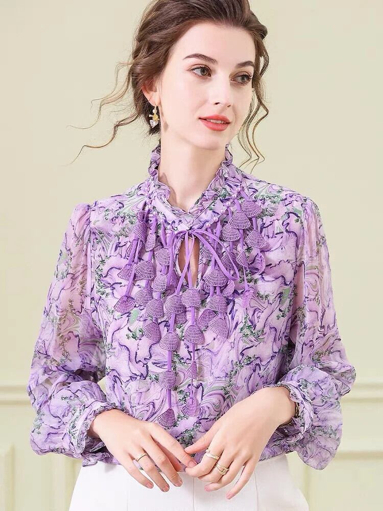 Pinkoz エレガントシフォンフラワーバイオレット高級ブラウスレースアップリボンファッションシックブラウス ピンク フラワーデザイン