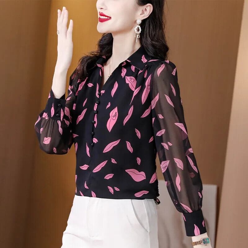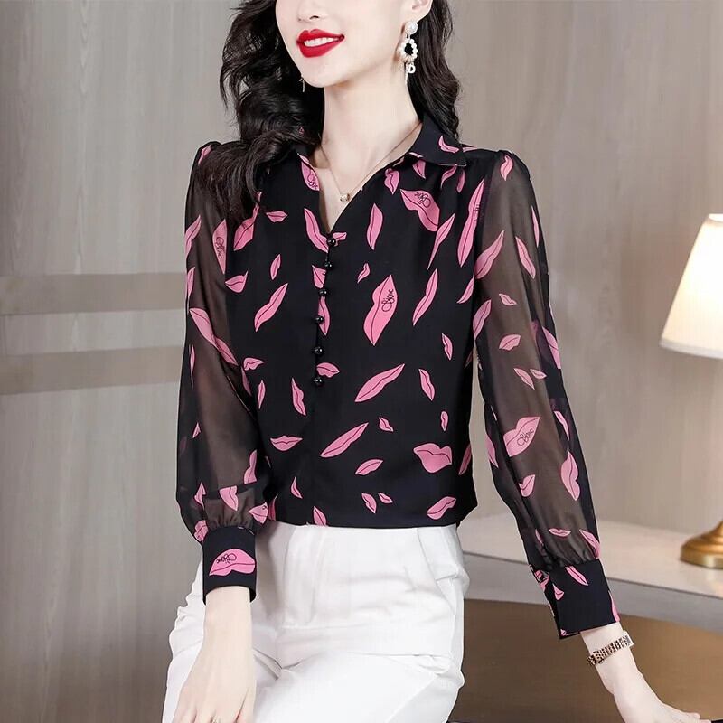 Pinkoz 春夏カジュアルプリントパターン v ネックシングルブレストシャツシフォンエレガントシック作業ブラウス ピンク スプリング 春物 サマー 夏物 Vネック