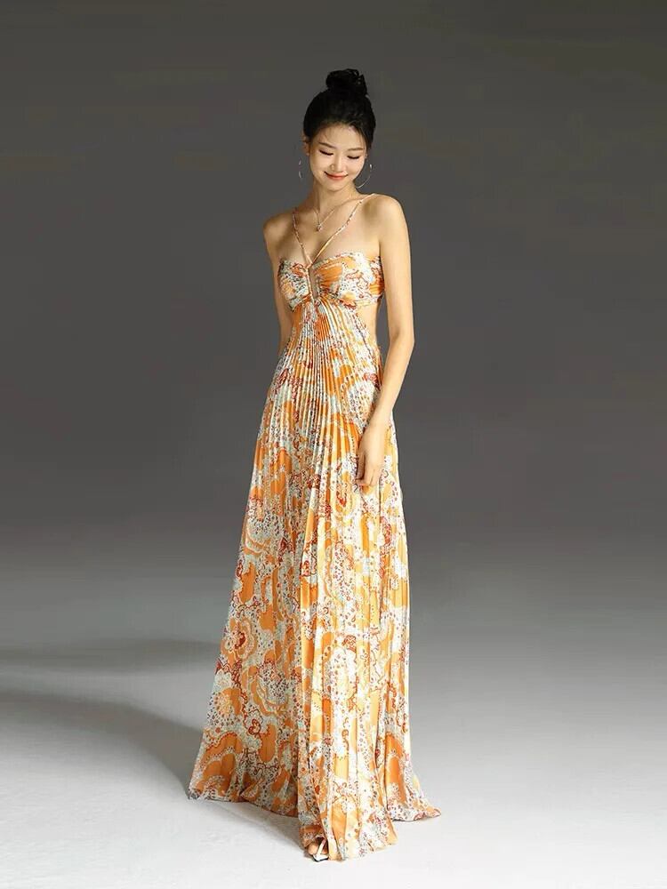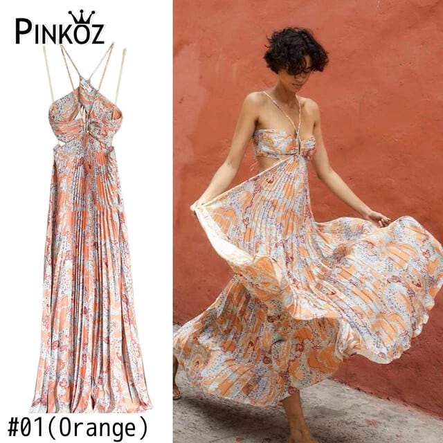 Pinkoz sping 夏デザイナー紫色ドレスセクシー背中開いたスパゲッティ stap ホリデービーチ自由奔放生きるマキシプリーツドレスvestidos ピンク サマー 夏物 パープル