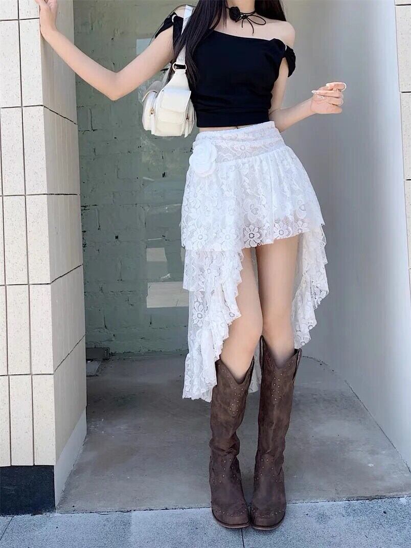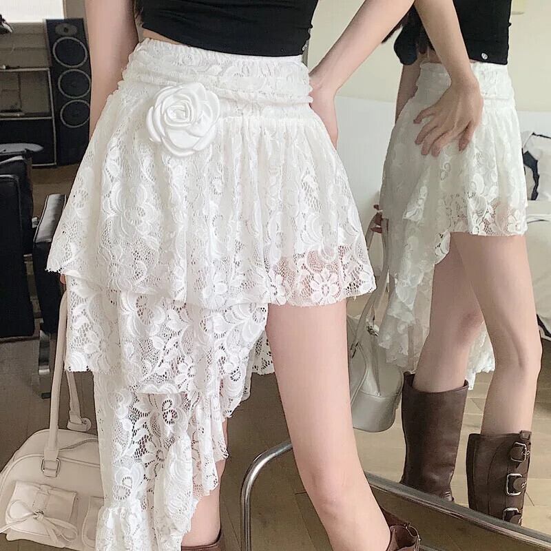 Pinkoz デザイナーファッション春夏レース不規則スカートファッションストリートシック白休日 INS Y2K ファルダス ピンク ホワイト スプリング 春物 サマー 夏物
