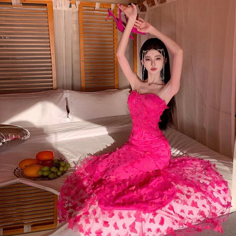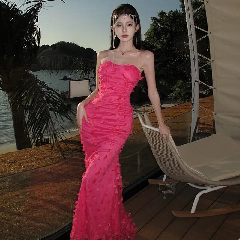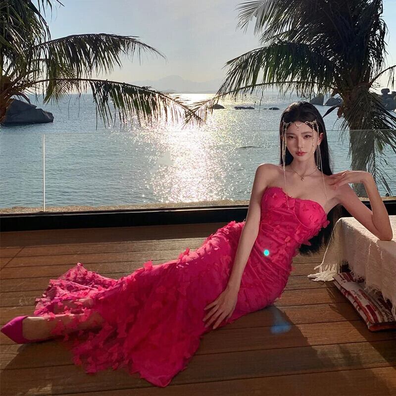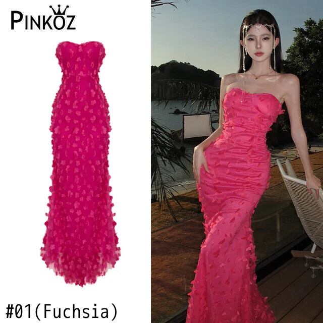 Pinkoz 滑走路デザイナースタイリッシュマキシドレスフクシアフラワーアップリケスパゲッティストラップぬるぬるマーメイドパーティーナイトドレスvestidos ピンク フラワーデザイン