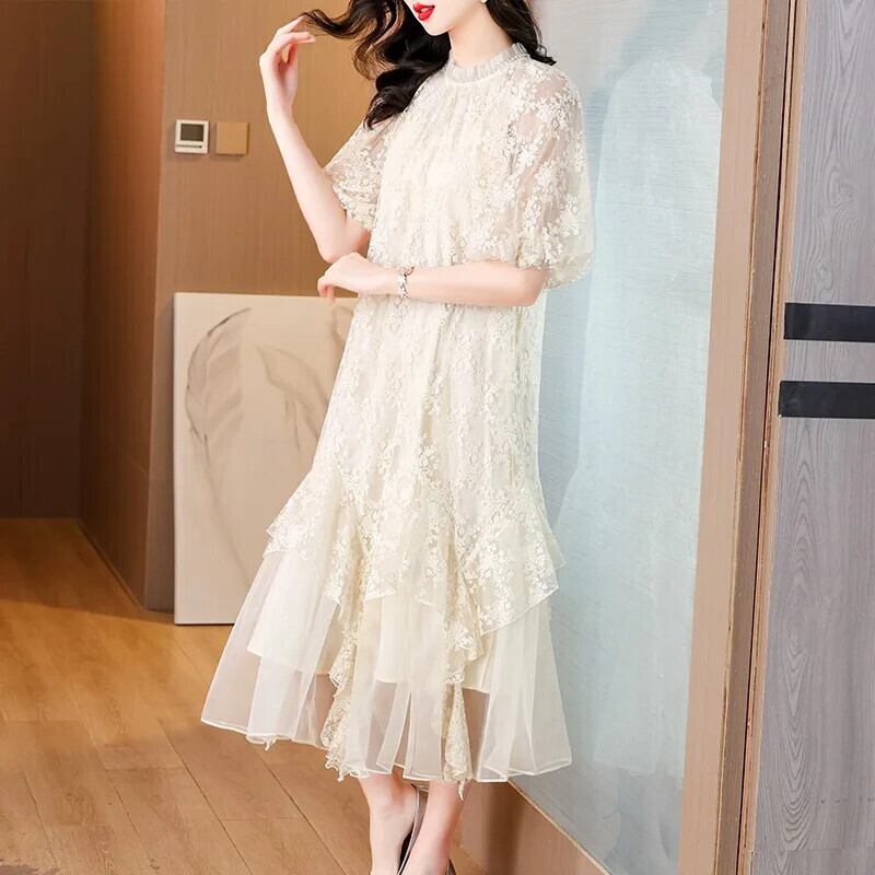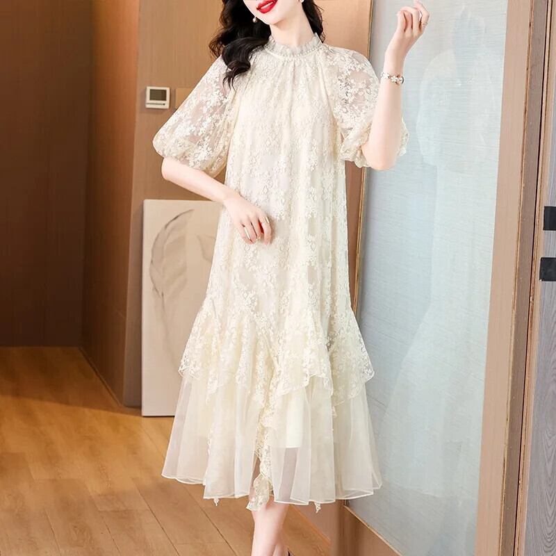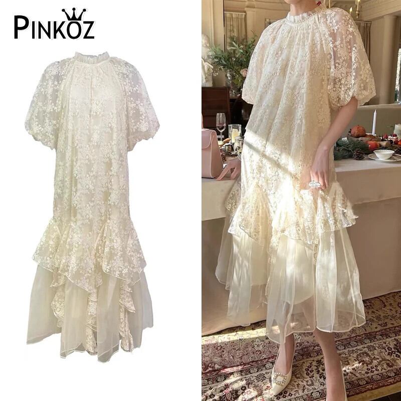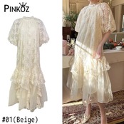 Pinkoz デザイナーベージュ刺繍 O ネックビーズパフスリーブドレスルーズ高級フェスティバルドレスビッグサイズ 3XL ピンク Oネック