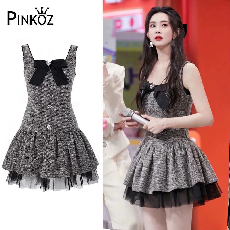 Pinkoz セレブスタイリッシュスパゲッティストラップミニパッチワーククリスタルボタン弓パーティードレス A ラインミニディナードレスvestidos ローブ ピンク リボン Aライン
