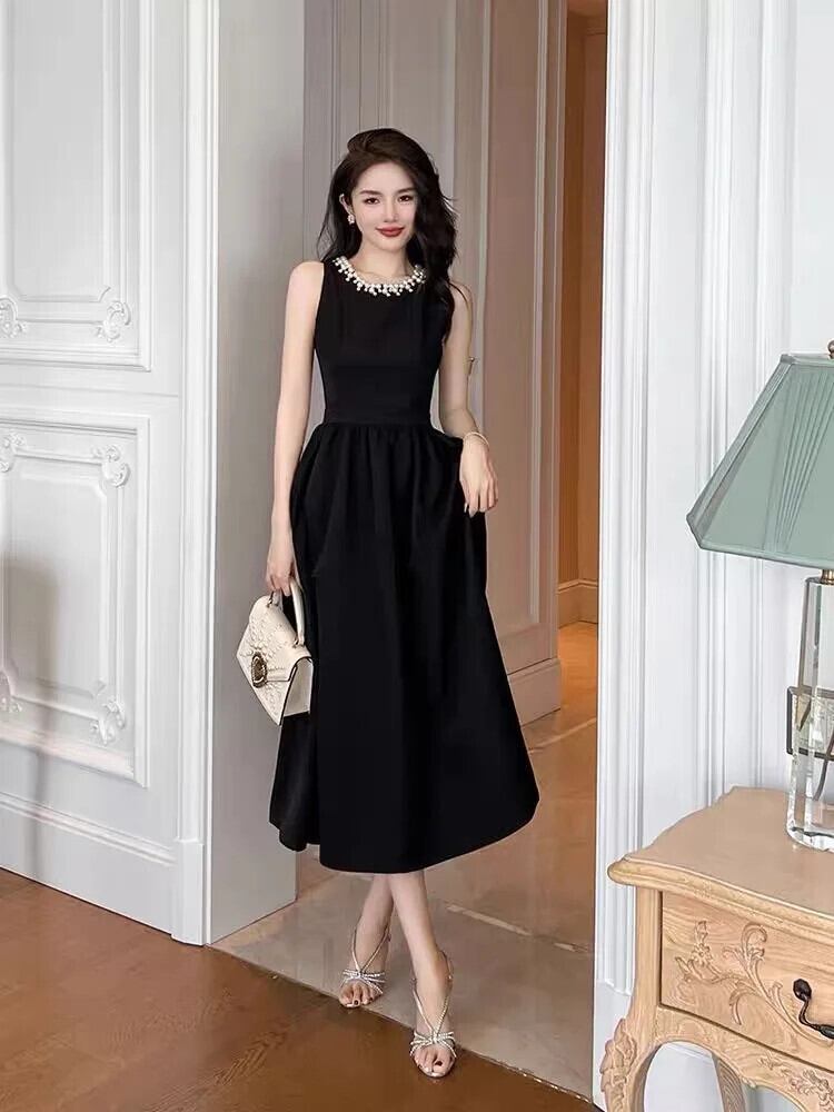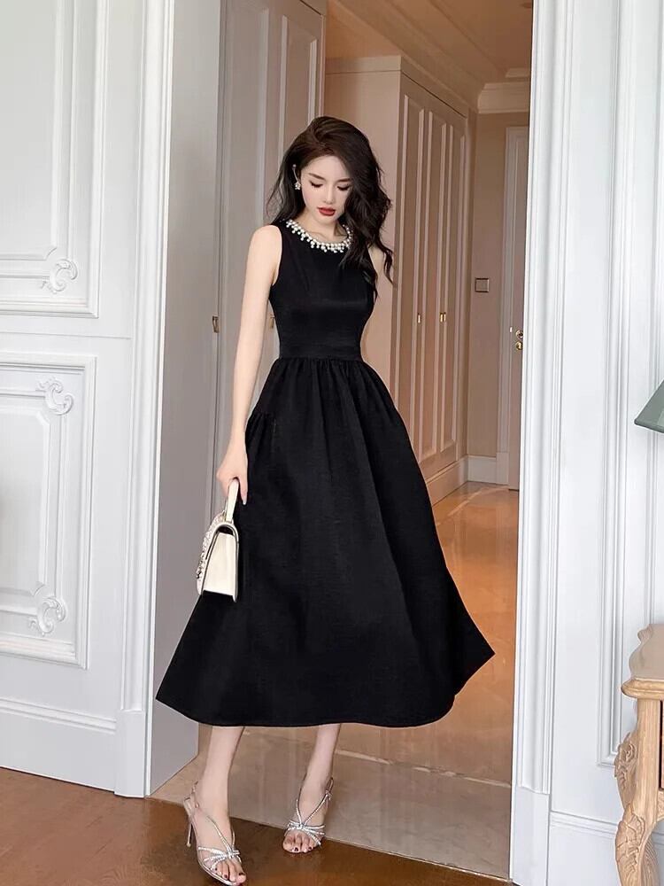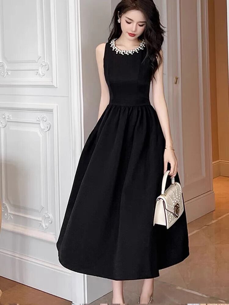 Pinkoz 黒ヘップバーンスタイリッシュミディ A ラインノースリーブビーズドレスハイウエスト夏パーティーエレガントファムドレス Vestidos ヴィンテージ ハイウェスト ピンク ブラック サマー 夏物 Aライン フェミニン ビンテージ