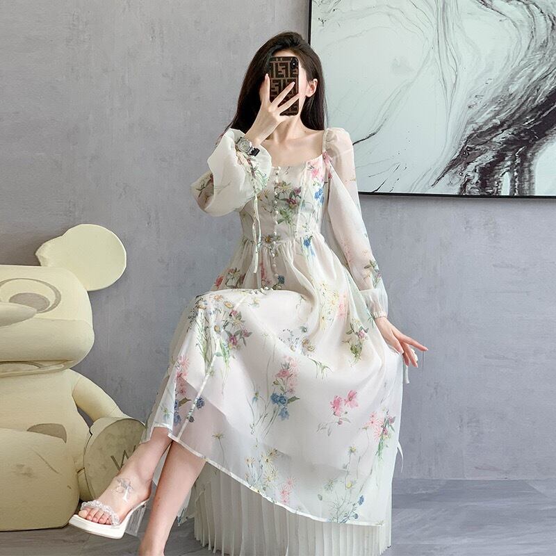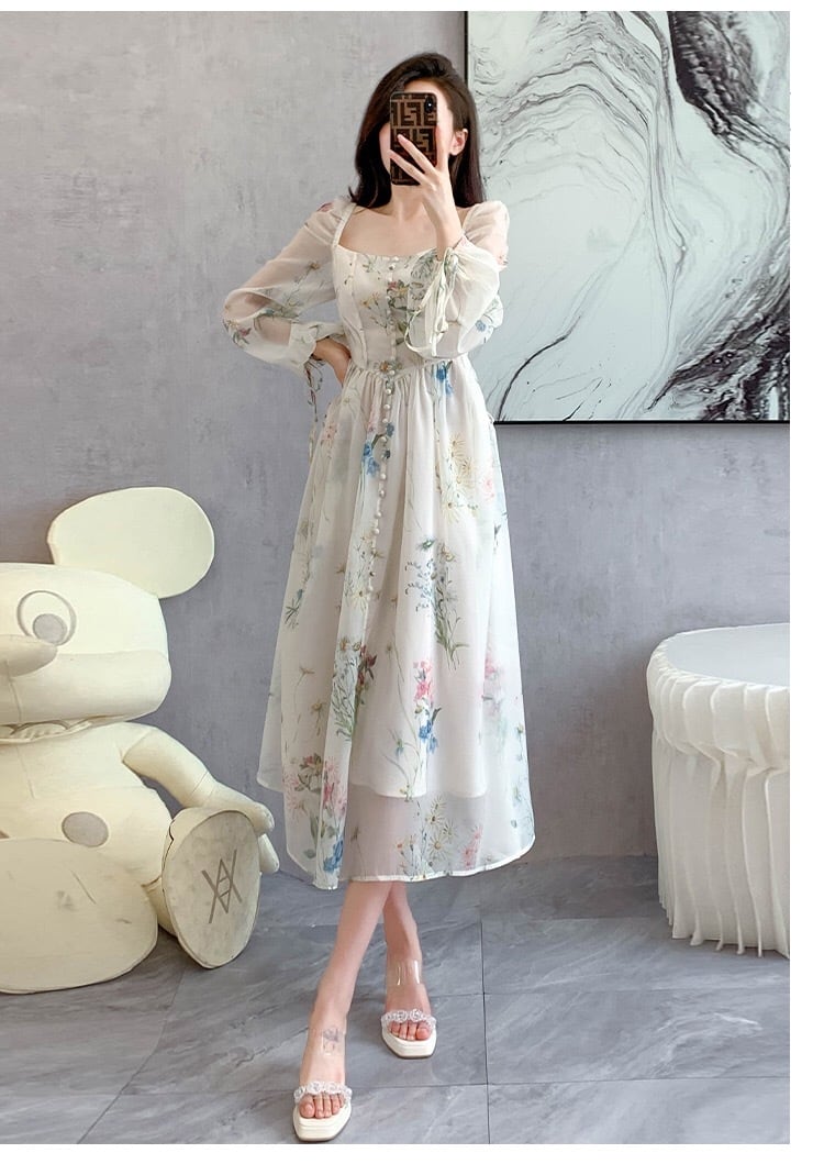 Pinkoz ヴィンテージ妖精ミディドレス花柄スクエアカラーランタンスリーブレースアップポケットヴィンテージファッションvestidosドレス ピンク スクウェア ビンテージ