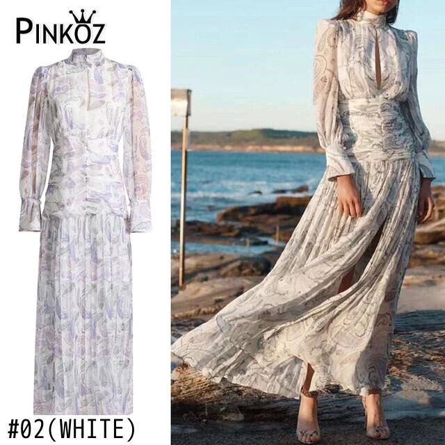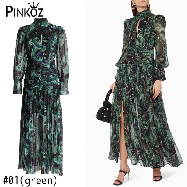 Pinkoz 滑走路デザイナーグリーン花柄プリントスタンドカラーランタンスリーブぬるぬるマキシシフォンドレスパーティーナイトvestidosローブ ピンク