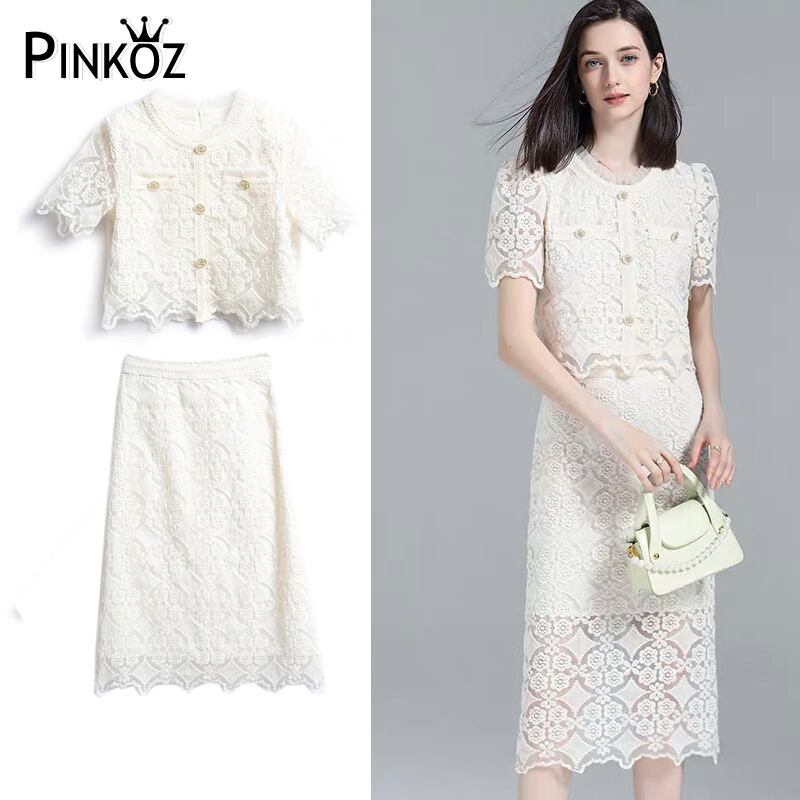 Pinkoz デザイナー 2 枚セット白レースショートトップスシングルブレストパッチワークシャーリング半袖トップスミディスカートスーツヴィンテージ ピンク ホワイト ハーフスリーブ ビンテージ