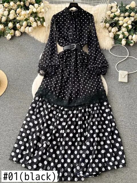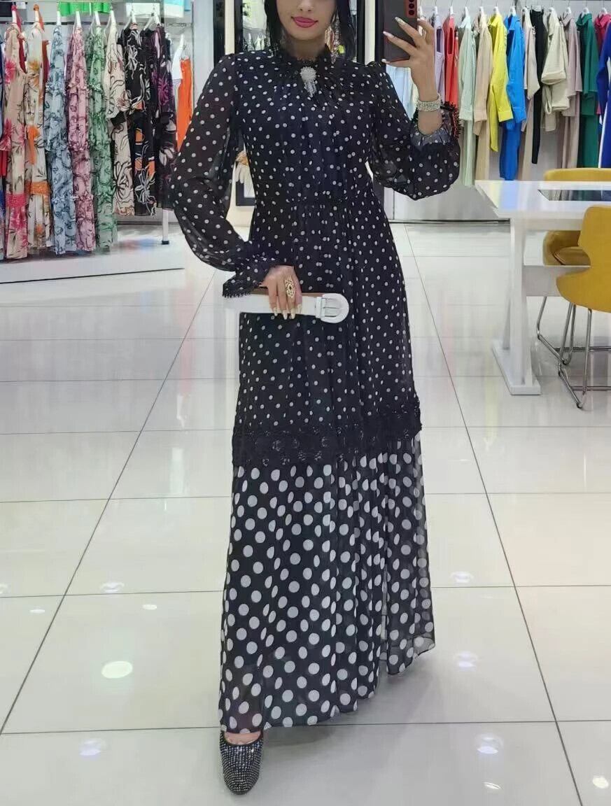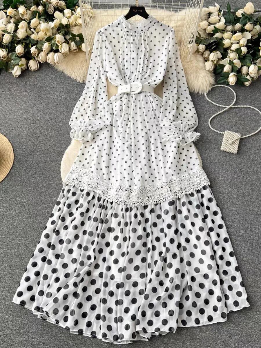 Pinkoz 滑走路デザイナーポルカドットパッチワークレーススタンドカラーマキシドレスピンクパーティーディナーvestidosベルトローブ付き ハーネス