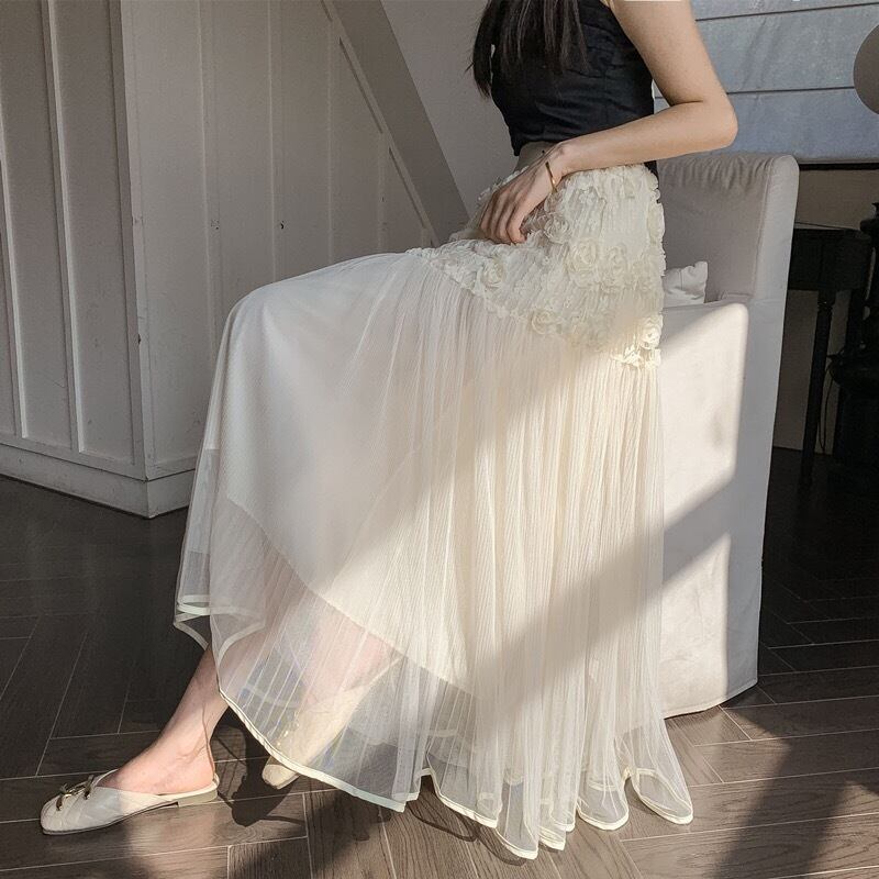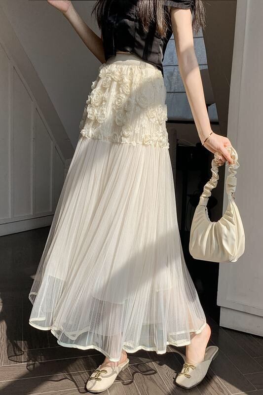 Pinkoz エレガントデザイナーベージュローズフラワー 3D マキシプリーツスカートパッチワーク弾性ウエストロングファッションシックパーティーファルダヴィンテージ ピンク エラスティック 伸縮 フラワーデザイン ビンテージ
