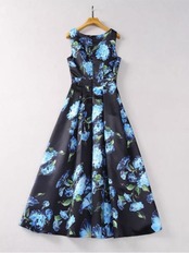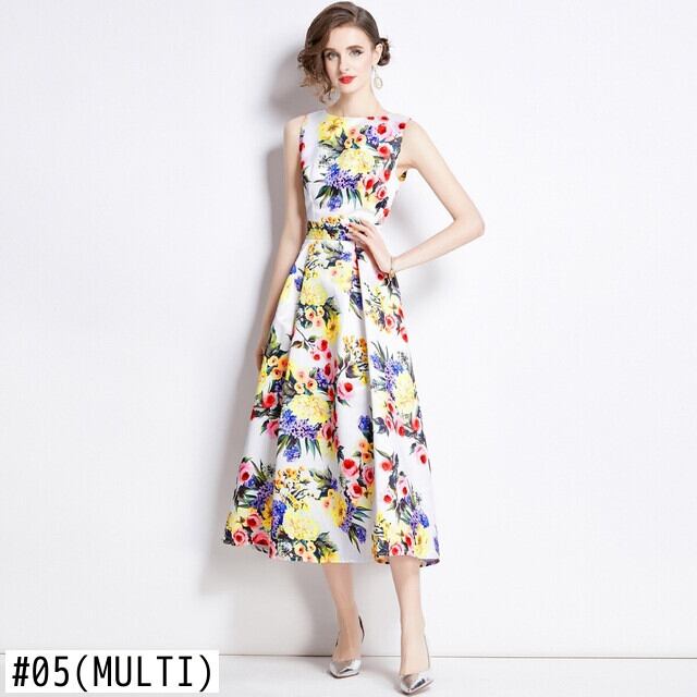 Pinkoz 滑走路デザイナー花柄タンクノースリーブ O ネックミディ A ラインドレス A ラインドレス Vestidos ローブデ ヴィンテージ za ピンク Oネック Aライン ビンテージ