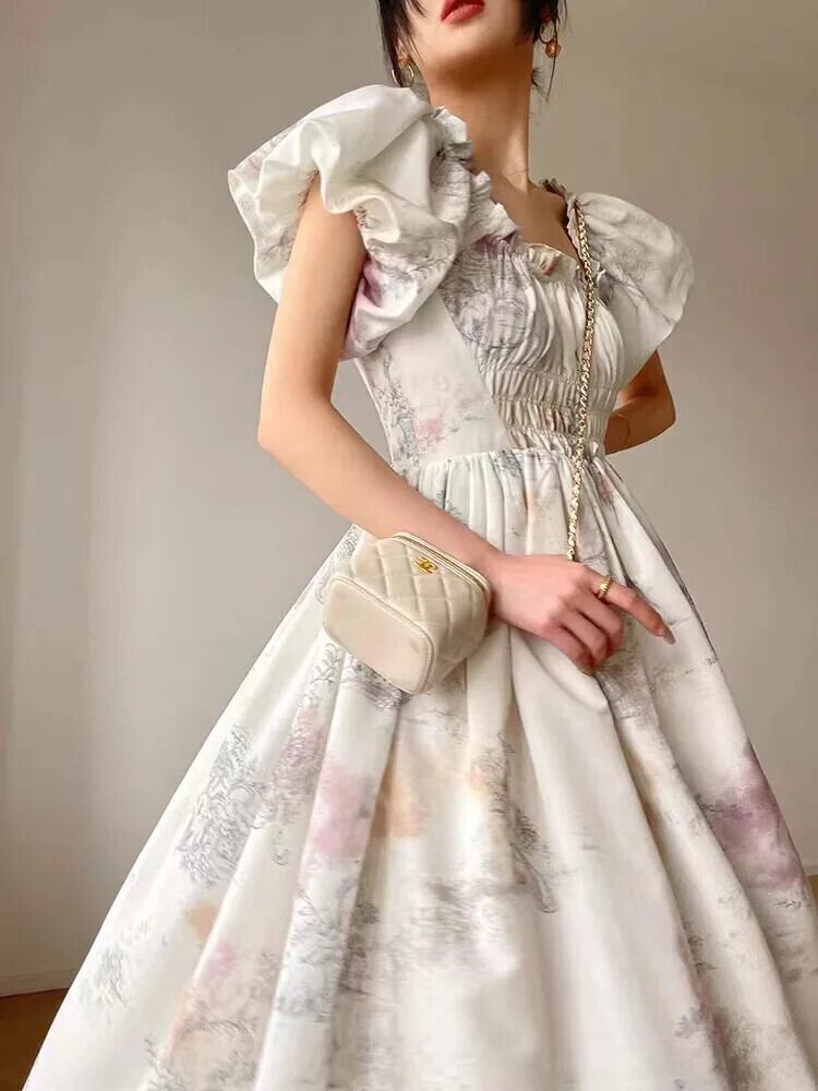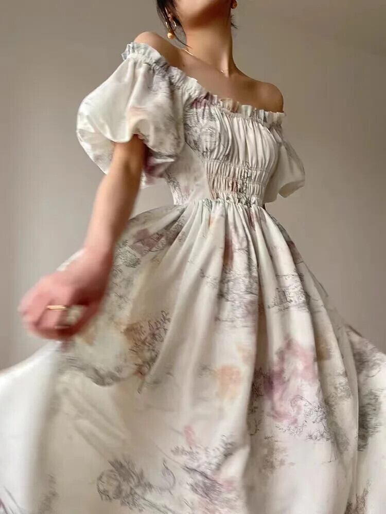 Pinkoz ランウェイデザイナースタイリッシュ花柄スラッシュネックパフスリーブ春夏弾性ウエストレースアップヴィンテージミディドレスローブ ピンク エラスティック 伸縮 スプリング 春物 サマー 夏物 ビンテージ