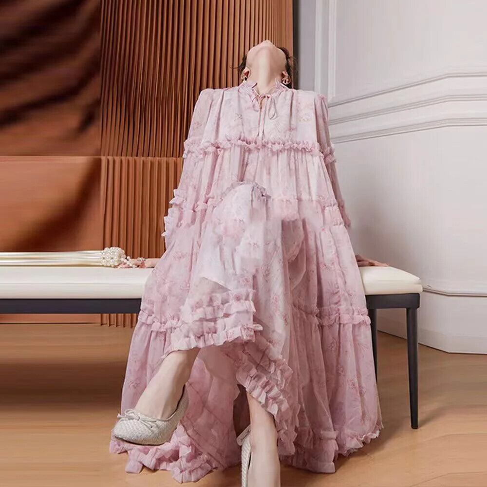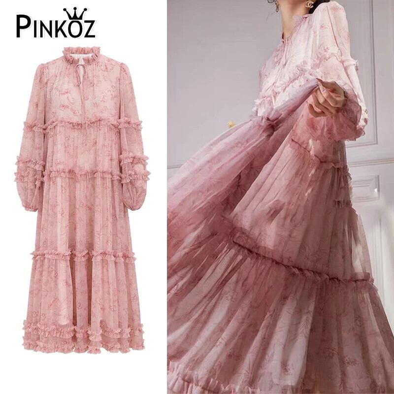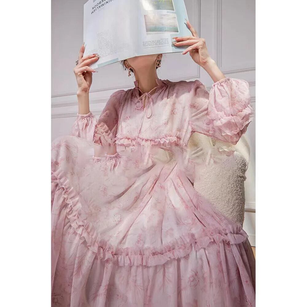 Pinkoz ヴィンテージルースシャーリングピンク花柄ミディロングドレスレースアップパーティーナイトドレスヴィンテージ ビンテージ