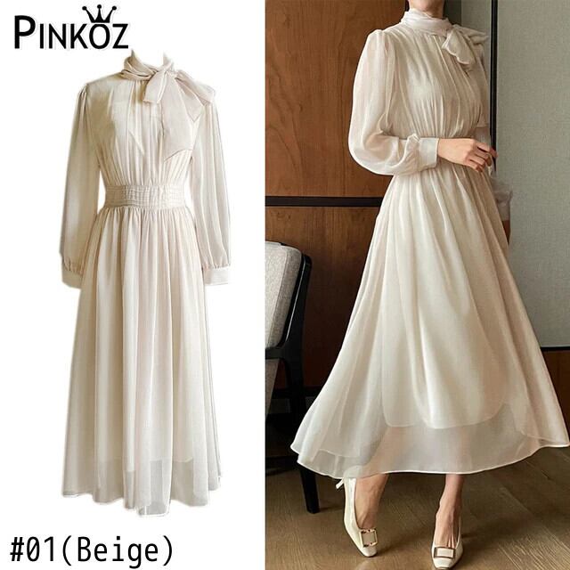 Pinkoz ヴィンテージ Vestidos ベージュ黒リボン襟シフォン A ラインミディドレスエレガント作業カジュアルデイリーシックドレスローブ ピンク ブラック Aライン ビンテージ