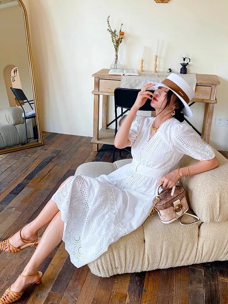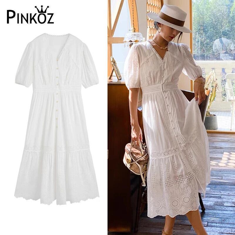 Pinkoz エレガントヴィンテージホワイトレースミディドレス v ネックシングルブレストボタンアウトフリルファムパーティードレスローブ ピンク ラッフル Vネック フェミニン ビンテージ