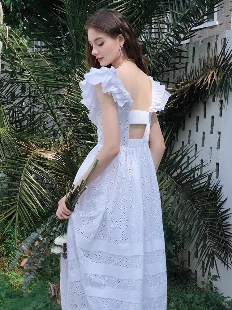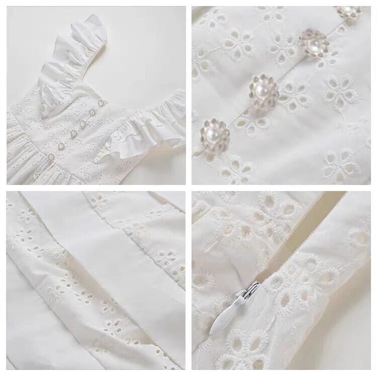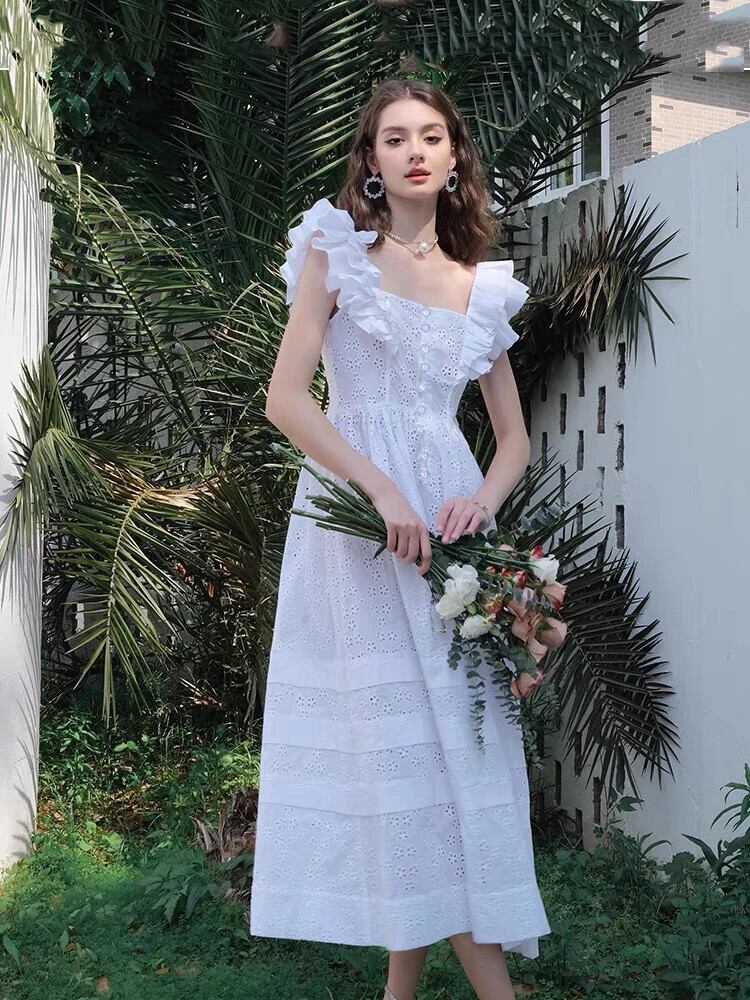 Pinkoz デザイナースクエアカラーレースアウトボタンフリルパーティードレスミディ A ラインバックレス Vestidos ローブ ピンク ラッフル Aライン スクウェア
