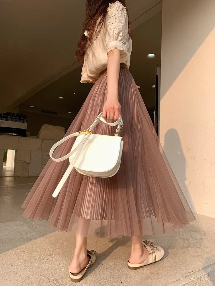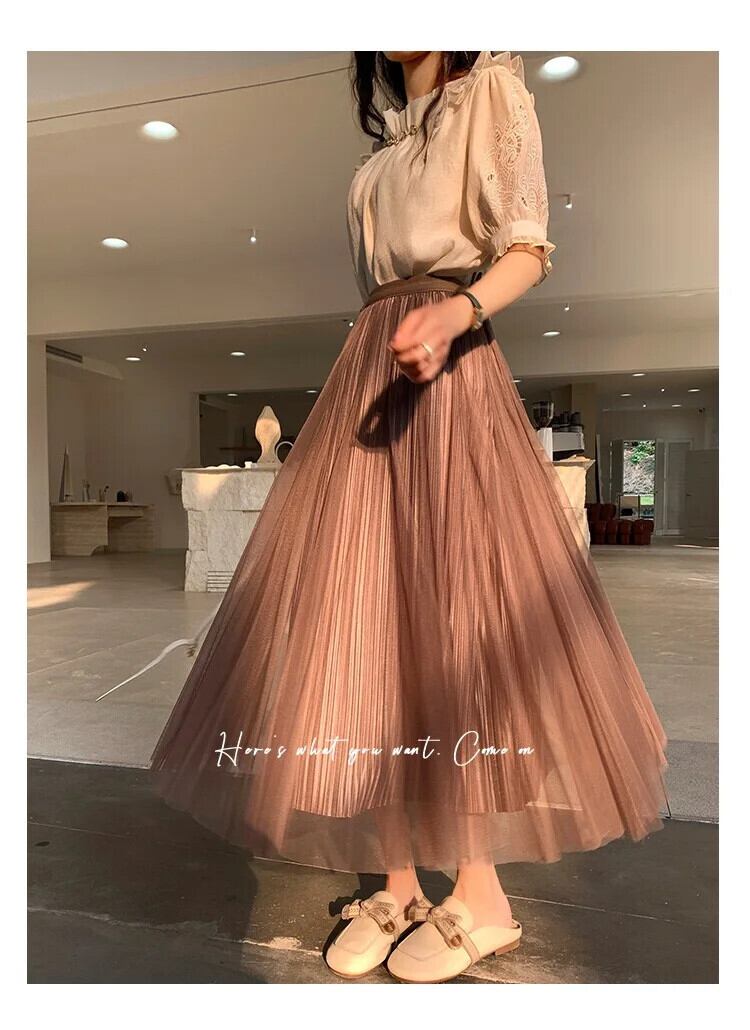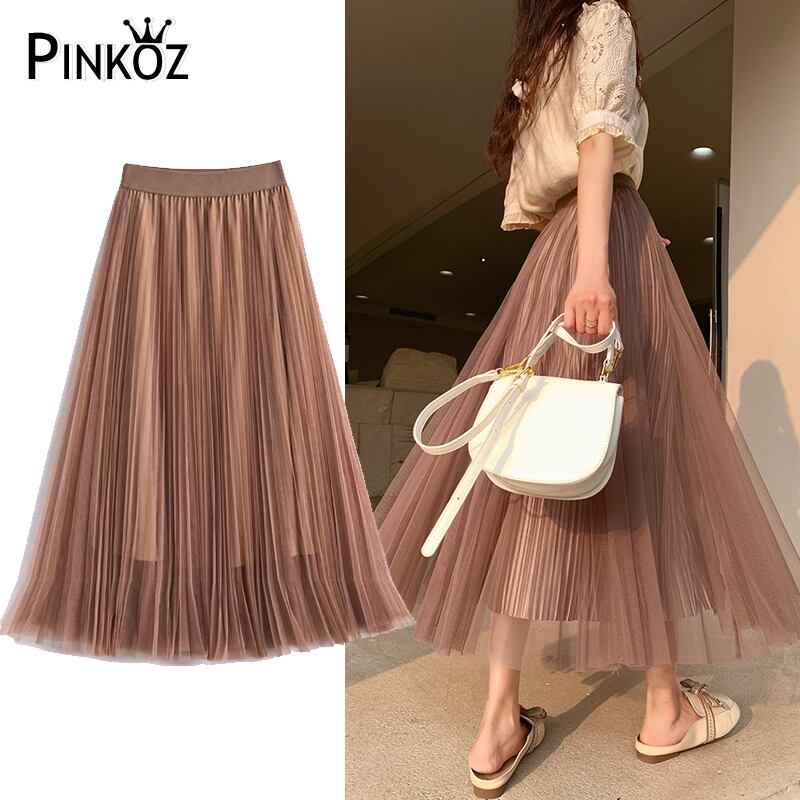 Pinkoz エレガント妖精ミディロングスカートメッシュエレガントソリッドブラウンプリーツファッション衣類スカートファム段ファルダヴィンテージ ピンク フェミニン ソリッドカラー ビンテージ
