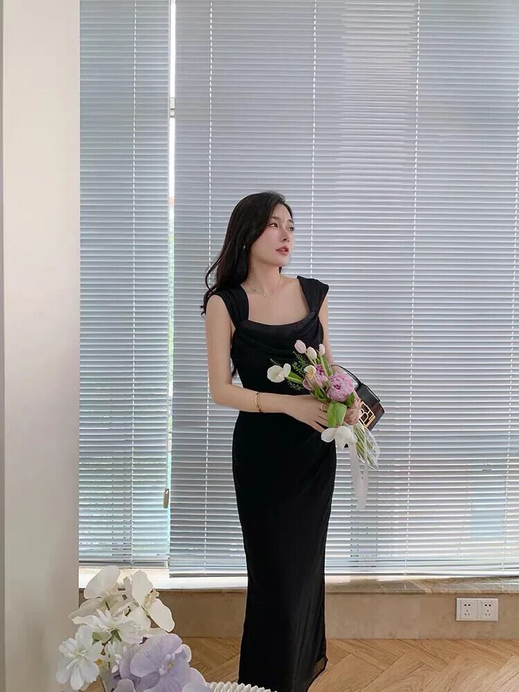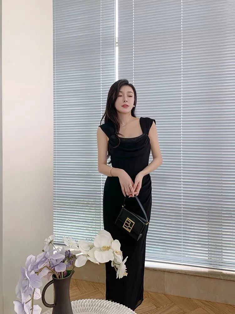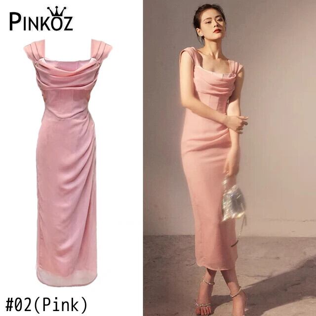Pinkoz デザイナーファッション衣類スパゲッティストラップピンクぬるぬる鉛筆ミディロングドレス折りシャーリングパーティーディナーvestidos