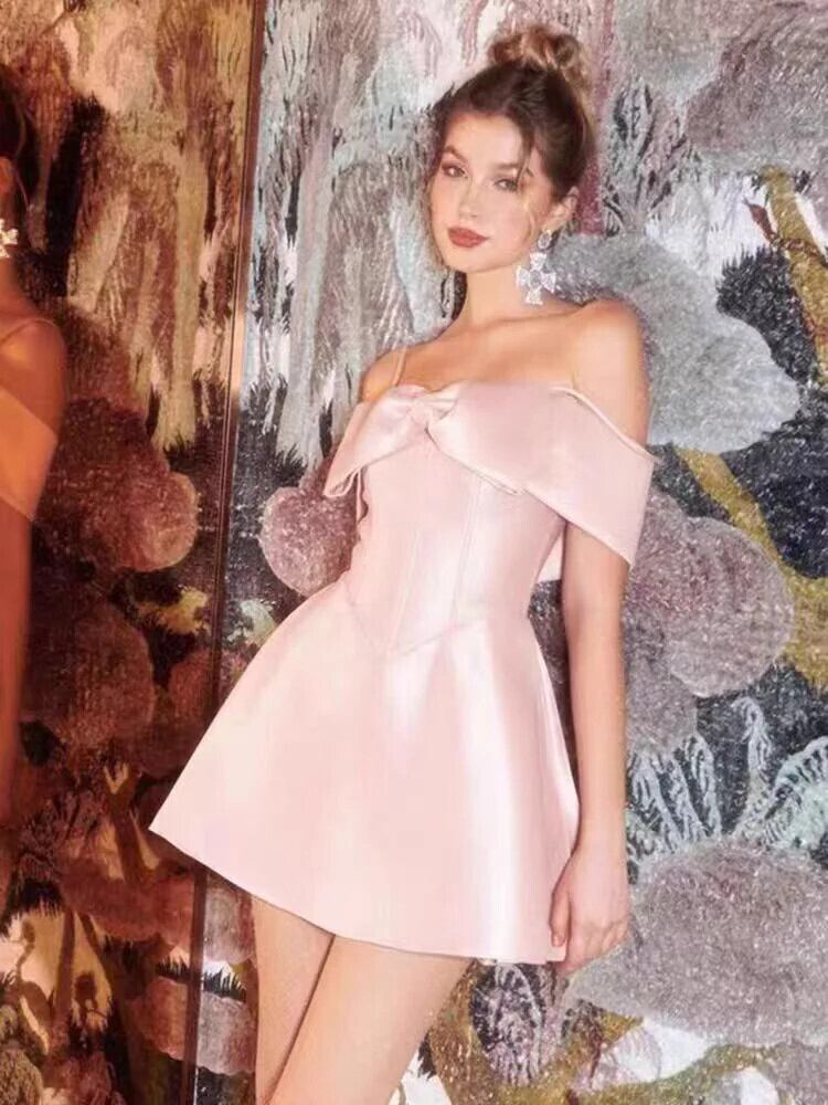 Pinkoz デザイナーピンク弓スパゲッティストラップ A ラインサテンミニドレスパーティーナイト若い甘い Vestidos フェスティバル リボン 大人ガーリー スウィート キュート カジュアル Aライン