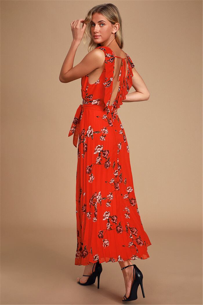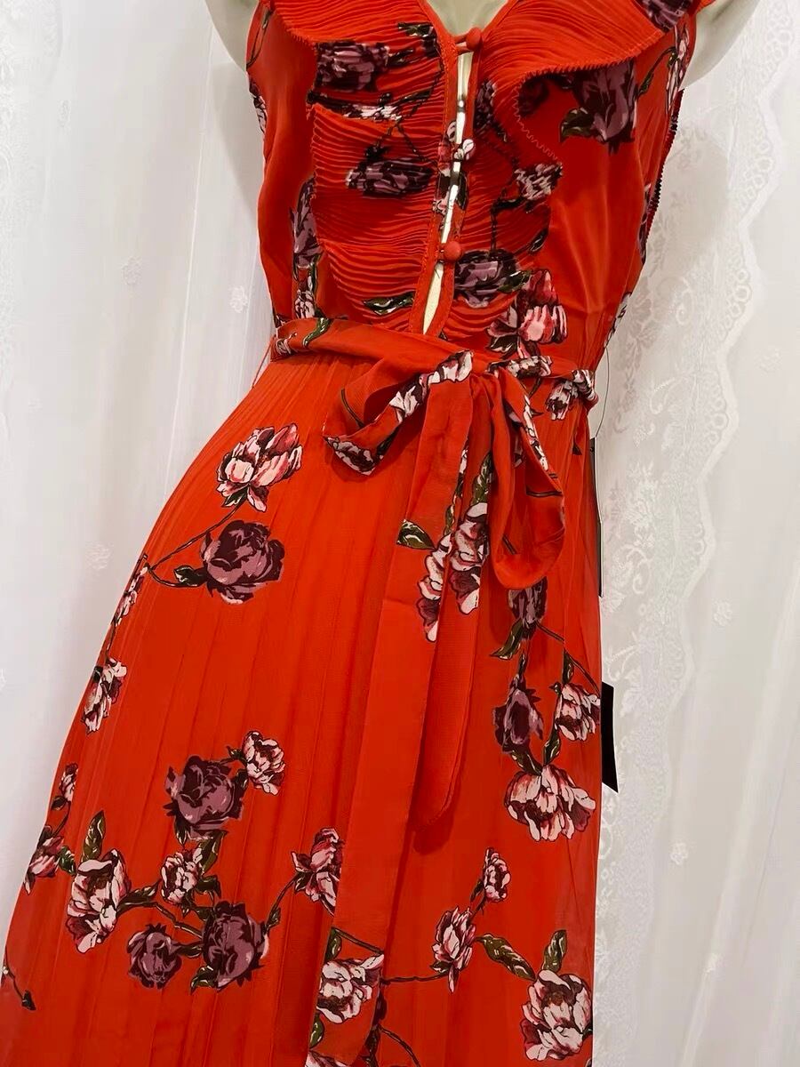 Pinkoz デザイナーオレンジレッド花柄プリーツミディドレスシングルブレストバックレスホリデーパーティーディナー A ラインドレスvestidos ピンク Aライン