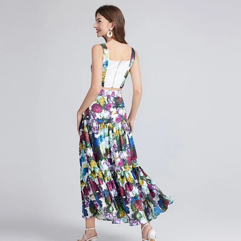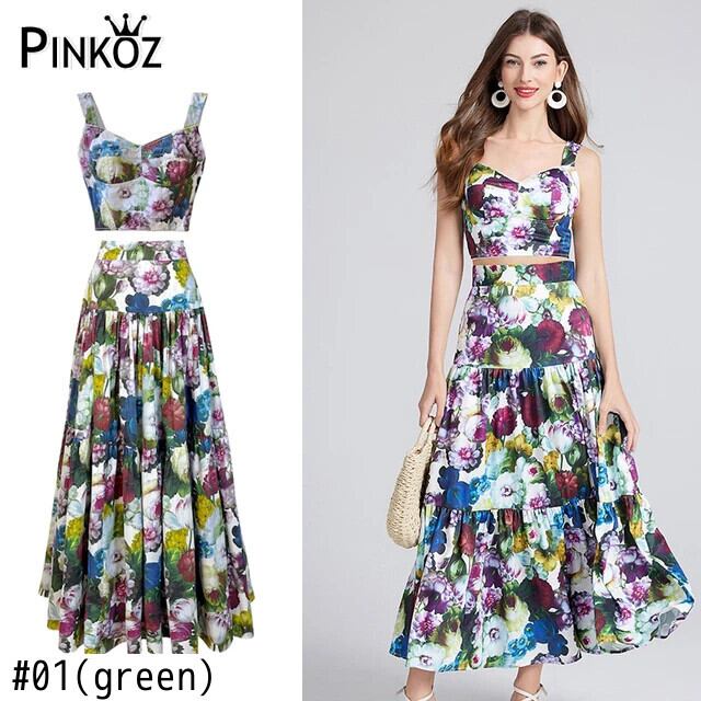 Pinkoz 2 個セットカジュアルショートタンクキャミソール花柄トップスマキシロングスカートホリデーシック段ファルダスーツヴィンテージ ピンク ビンテージ