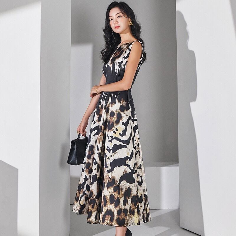 Pinkoz ヒョウ柄プリントノースリーブミディドレス O ネックタンクエレガントオフィスレディカジュアルハイストリート Vestidos ヴィンテージ ピンク Oネック ビンテージ 会社 学校 通勤や通学にも