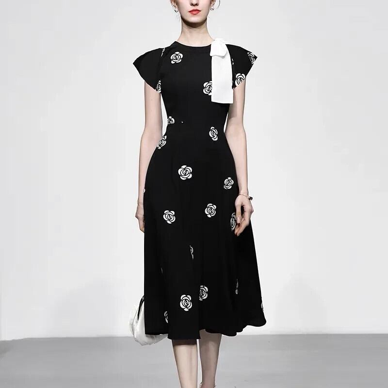 Pinkoz デザイナー黒リボン弓椿花刺繍ミディ A ラインドレスエレガントパーティーナイト OL ドレスvestidos ピンク ブラック Aライン フラワーデザイン