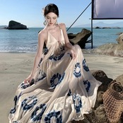 Pinkoz ホリデーファッション花柄プリント V ネック背中開いたセクシービーチ職業マキシルーズドレス Vestidos ヴィンテージ ピンク Vネック ビンテージ