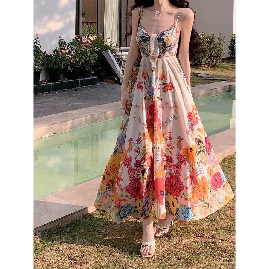 Pinkoz ホリデーシックスパゲッティストラップ弓夏花柄プリントノースリーブマキシドレスシックローブ ピンク リボン サマー 夏物