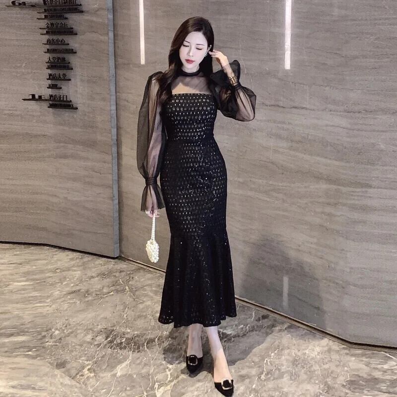 Pinkoz 滑走路デザイナースタイリッシュ黒スパンコールパッチワークメッシュマーメイドロングミディドレスヴィンテージ Vestidos ローブ · デ · Mujer ファッション ピンク ブラック ビンテージ