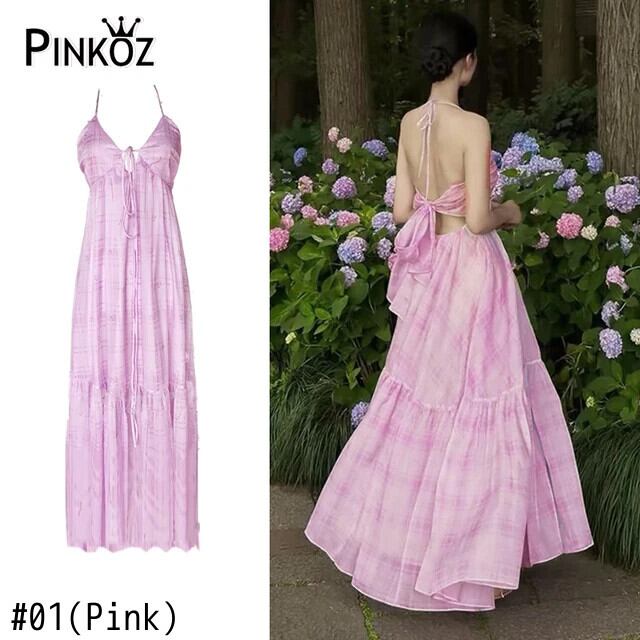 Pinkoz 滑走路デザイナー v ネックスパゲッティストラップ弓背中開いたピンクチェック柄マキシドレスシフォンホリデーシックファッション Vestidos 夏 リボン サマー 夏物 Vネック