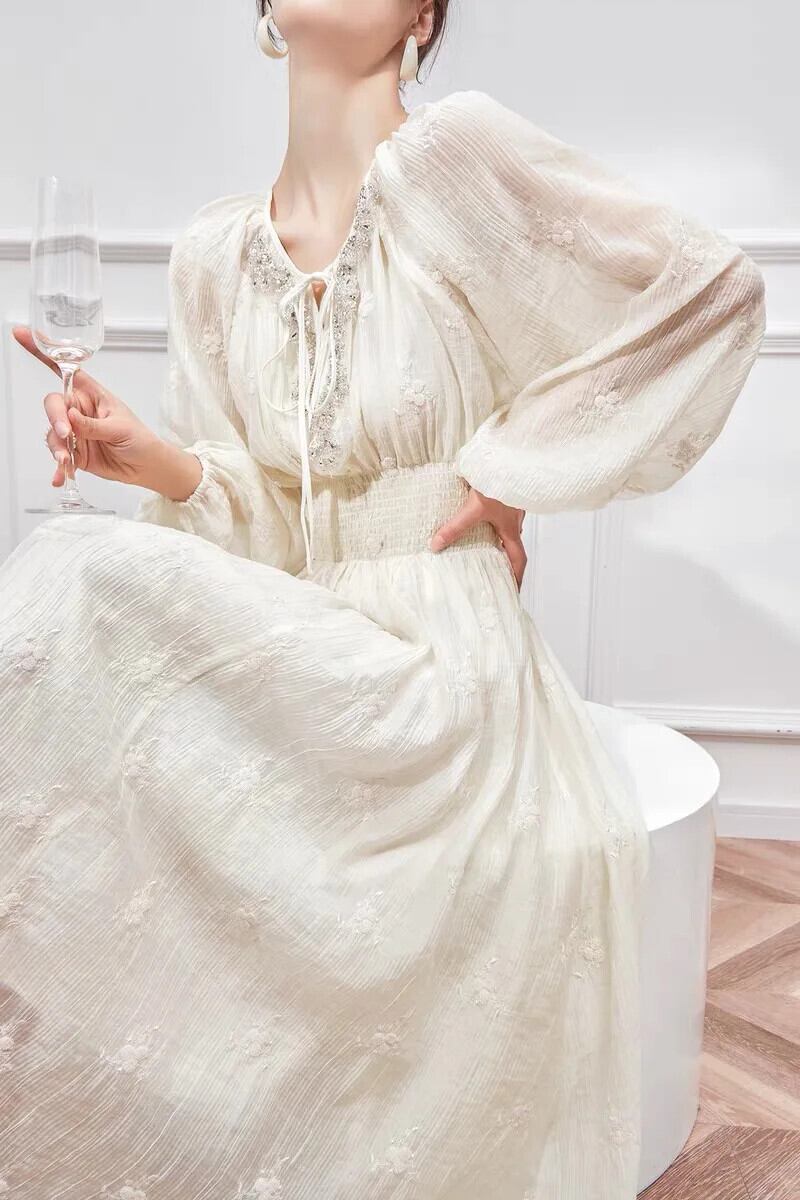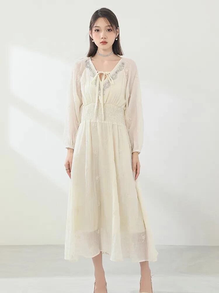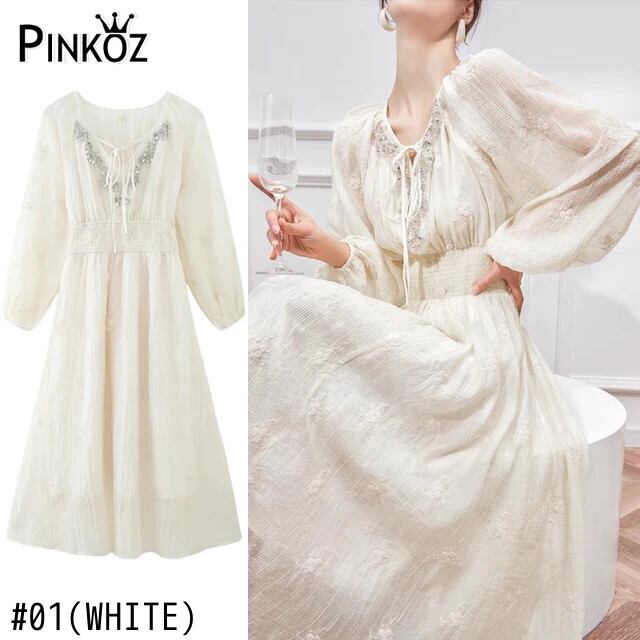 Pinkoz ホワイトドレス弾性ウエスト A ライン刺繍 V ネッククリスタルビーズ長袖ドレスパーティーナイト Vestidos ローブ ロング ピンク エラスティック 伸縮 Vネック Aライン