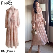 Pinkoz ミディ a ラインドレス長袖春夏弓襟エレガントオフィスレディピンクファッション衣類 Vestidos ロング リボン スプリング 春物 サマー 夏物 Aライン 会社 学校 通勤や通学にも